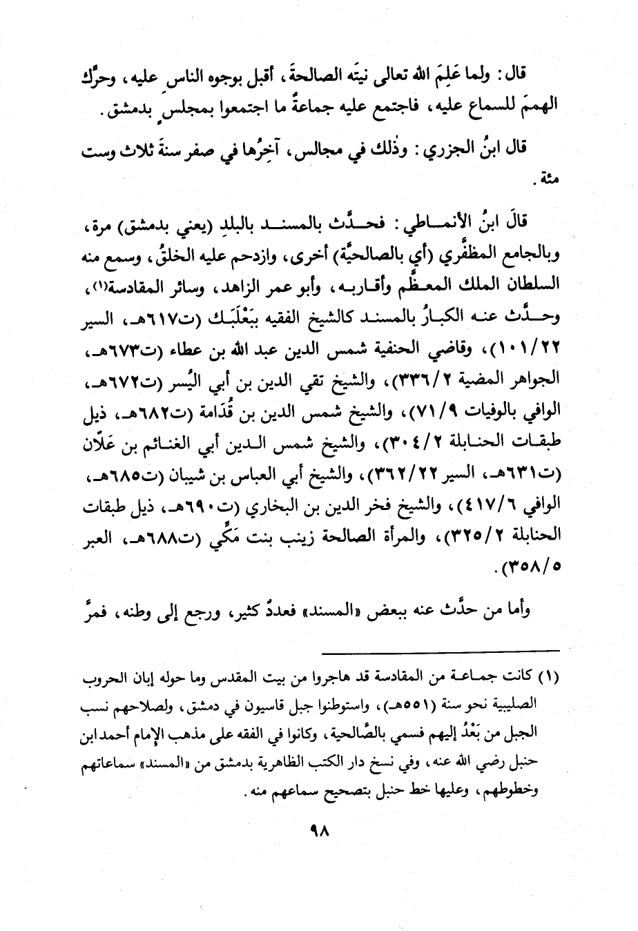 (١) كانت جماعة من المقادسة قد هاجروا من بيت المقدس وما حوله إبان الحروب الصليبية نحو سنة (٥٥١ هـ) ، واستوطنوا جبل قاسيون في دمشق، ولصلاحهم نسب الجبل من بَعْدُ إليهم فسمي بالصَّالحية، وكانوا في الفقه على مذهب الإمام أحمد ابن حنبل رضي الله عنه، وفي نسخ دار الكتب الظاهرية بدمشق من " المسند " سماعاتهم وخطوطهم، وعليها خط حنبل بتصحيح سماعهم منه.