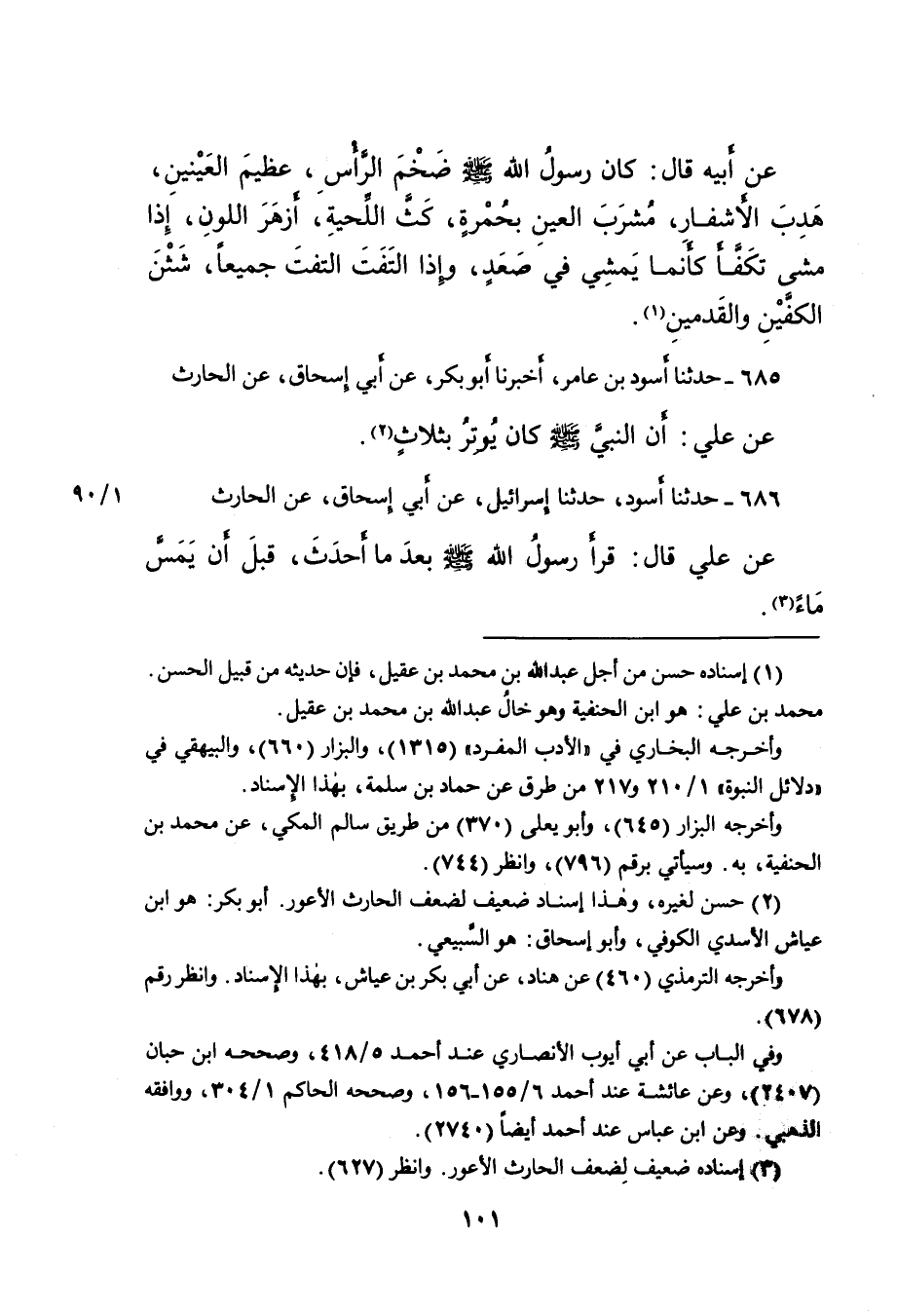 ٦٨٥ - حَدَّثَنَا أَسْوَدُ بْنُ عَامِرٍ، أَخْبَرَنَا أَبُو بَكْرٍ، عَنْ أَبِي إِسْحَاقَ، عَنِ الْحَارِثِ، عَنْ عَلِيٍّ: " أَنَّ النَّبِيَّ صَلَّى اللهُ عَلَيْهِ وَسَلَّمَ كَانَ يُوتِرُ بِثَلاثٍ " (٢)