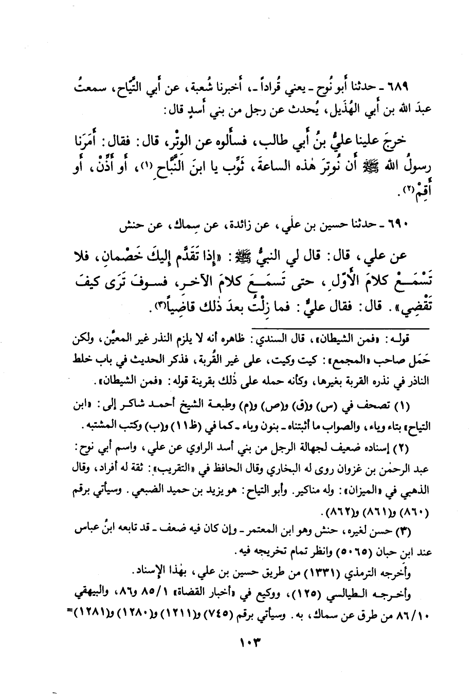 ٦٩٠ - حَدَّثَنَا حُسَيْنُ بْنُ عَلِيٍّ، عَنْ زَائِدَةَ، عَنْ سِمَاكٍ، عَنْ حَنَشٍ، عَنْ عَلِيٍّ، قَالَ: قَالَ لِي النَّبِيُّ صَلَّى اللهُ عَلَيْهِ وَسَلَّمَ: " إِذَا تَقَدَّمَ إِلَيْكَ خَصْمَانِ، فَلا تَسْمَعْ كَلامَ الْأَوَّلِ، حَتَّى تَسْمَعَ كَلامَ الْآخَرِ، فَسَوْفَ تَرَى كَيْفَ تَقْضِي " قَالَ: فَقَالَ عَلِيٌّ: " فَمَا زِلْتُ بَعْدَ ذَلِكَ قَاضِيًا " (٣)