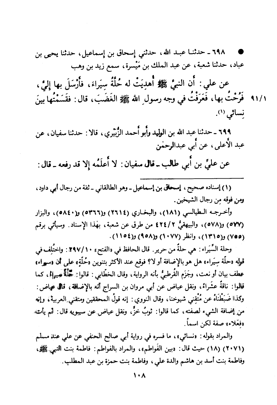 • ٦٩٨ - حَدَّثَنَا عَبْدُ اللهِ، حَدَّثَنِي إِسْحَاقُ بْنُ إِسْمَاعِيلَ، حَدَّثَنَا يَحْيَى بْنُ عَبَّادٍ، حَدَّثَنَا شُعْبَةُ، عَنْ عَبْدِ الْمَلِكِ بْنِ مَيْسَرَةَ، سَمِعَ زَيْدَ بْنَ وَهْبٍ، عَنْ عَلِيٍّ: " أَنَّ النَّبِيَّ صَلَّى اللهُ عَلَيْهِ وَسَلَّمَ أُهْدِيَتْ لَهُ حُلَّةٌ سِيَرَاءُ، فَأَرْسَلَ بِهَا إِلَيَّ، فَرُحْتُ بِهَا، فَعَرَفْتُ فِي وَجْهِ رَسُولِ اللهِ صَلَّى اللهُ عَلَيْهِ وَسَلَّمَ الْغَضَبَ، قَالَ: فَقَسَمْتُهَا بَيْنَ نِسَائِي " (١)