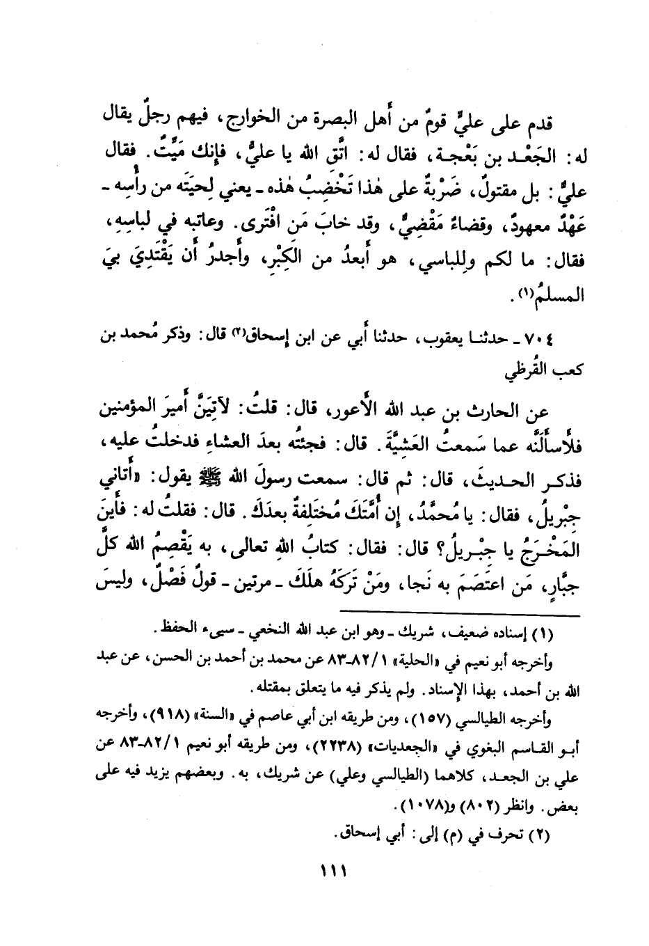 ٧٠٤ - حَدَّثَنَا يَعْقُوبُ، حَدَّثَنَا أَبِي، عَنْ ابْنِ إِسْحَاقَ (٢) قَالَ: وَذَكَرَ مُحَمَّدُ بْنُ كَعْبٍ الْقُرَظِيُّ، عَنِ الْحَارِثِ بْنِ عَبْدِ اللهِ الْأَعْوَرِ، قَالَ: قُلْتُ: لَآتِيَنَّ أَمِيرَ الْمُؤْمِنِينَ فَلَأَسْأَلَنَّهُ عَمَّا سَمِعْتُ الْعَشِيَّةَ. قَالَ: فَجِئْتُهُ بَعْدَ الْعِشَاءِ فَدَخَلْتُ عَلَيْهِ، فَذَكَرَ الْحَدِيثَ، قَالَ: ثُمَّ قَالَ: سَمِعْتُ رَسُولَ اللهِ صَلَّى اللهُ عَلَيْهِ وَسَلَّمَ يَقُولُ: " أَتَانِي جِبْرِيلُ، فَقَالَ: يَا مُحَمَّدُ، إِنَّ أُمَّتَكَ مُخْتَلِفَةٌ بَعْدَكَ. قَالَ: فَقُلْتُ لَهُ: فَأَيْنَ الْمَخْرَجُ يَا جِبْرِيلُ؟ قَالَ: فَقَالَ: كِتَابُ اللهِ تَعَالَى، بِهِ يَقْصِمُ اللهُ كُلَّ جَبَّارٍ، مَنِ اعْتَصَمَ بِهِ نَجَا، وَمَنْ تَرَكَهُ هَلَكَ - مَرَّتَيْنِ - قَوْلٌ فَصْلٌ، وَلَيْسَ