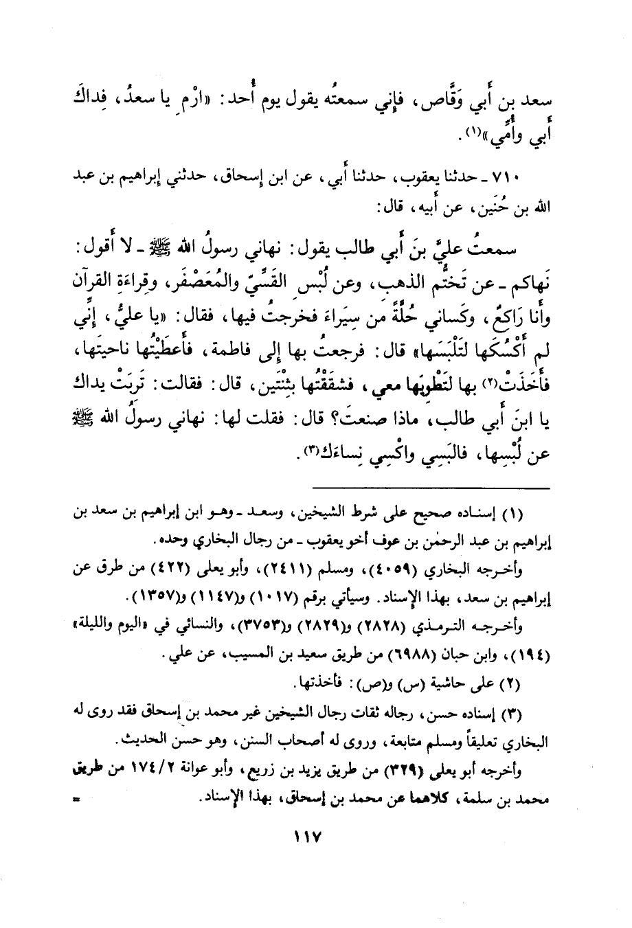 ٧١٠ - حَدَّثَنَا يَعْقُوبُ، حَدَّثَنَا أَبِي، عَنِ ابْنِ إِسْحَاقَ، حَدَّثَنِي إِبْرَاهِيمُ بْنُ عَبْدِ اللهِ بْنِ حُنَيْنٍ، عَنْ أَبِيهِ، قَالَ: سَمِعْتُ عَلِيَّ بْنَ أَبِي طَالِبٍ، يَقُولُ: نَهَانِي رَسُولُ اللهِ صَلَّى اللهُ عَلَيْهِ وَسَلَّمَ - لَا أَقُولُ نَهَاكُمْ - عَنْ تَخَتُّمِ الذَّهَبِ، وَعَنْ لُبْسِ الْقَسِّيِّ، وَالْمُعَصْفَرِ، وَقِرَاءَةِ الْقُرْآنِ وَأَنَا رَاكِعٌ، وَكَسَانِي حُلَّةً مِنْ سِيَرَاءَ فَخَرَجْتُ فِيهَا، فَقَالَ: " يَا عَلِيُّ، إِنِّي لَمْ أَكْسُكَهَا لِتَلْبَسَهَا " قَالَ: فَرَجَعْتُ بِهَا إِلَى فَاطِمَةَ فَأَعْطَيْتُهَا نَاحِيَتَهَا، فَأَخَذَتْ (٢) بِهَا لِتَطْوِيَهَا مَعِي، فَشَقَّقْتُهَا بِثِنْتَيْنِ، قَالَ: فَقَالَتْ: تَرِبَتْ يَدَاكَ يَا ابْنَ أَبِي طَالِبٍ، مَاذَا صَنَعْتَ؟ قَالَ: فَقُلْتُ لَهَا: نَهَانِي رَسُولُ اللهِ صَلَّى اللهُ عَلَيْهِ وَسَلَّمَ عَنْ لُبْسِهَا، فَالْبَسِي وَاكْسِي نِسَاءَكِ (٣)