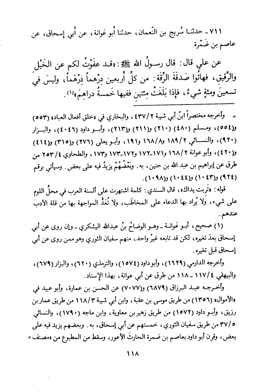 ٧١١ - حَدَّثَنَا سُرَيْجُ بْنُ النُّعْمَانِ، حَدَّثَنَا أَبُو عَوَانَةَ، عَنْ أَبِي إِسْحَاقَ، عَنْ عَاصِمِ بْنِ ضَمْرَةَ، عَنْ عَلِيٍّ، قَالَ: قَالَ رَسُولُ اللهِ صَلَّى اللهُ عَلَيْهِ وَسَلَّمَ: " قَدْ عَفَوْتُ لَكُمْ عَنِ الْخَيْلِ وَالرَّقِيقِ، فَهَاتُوا صَدَقَةَ الرِّقَّةِ: مِنْ كُلِّ أَرْبَعِينَ دِرْهَمًا دِرْهَمًا، وَلَيْسَ فِي تِسْعِينَ وَمِائَةٍ شَيْءٌ، فَإِذَا بَلَغَتْ مِائَتَيْنِ فَفِيهَا خَمْسَةُ دَرَاهِمَ " (١)