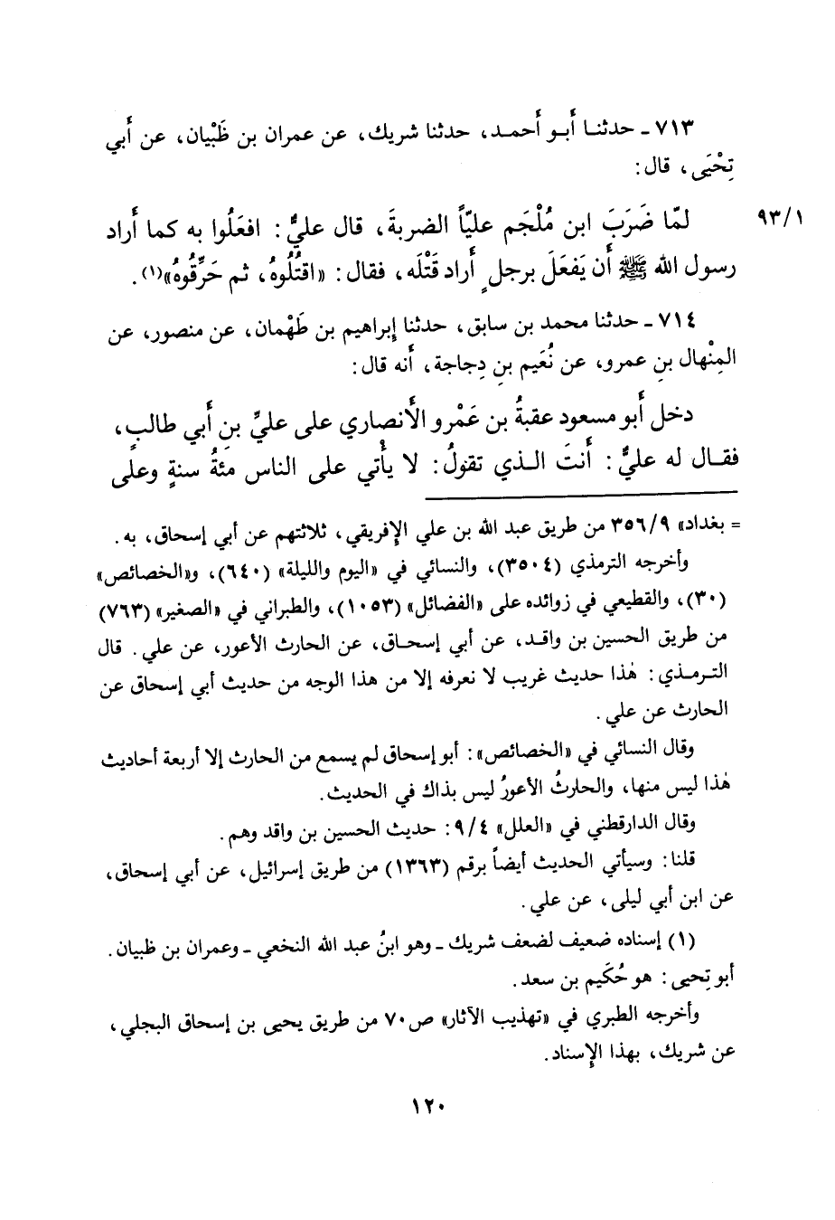 ٧١٣ - حَدَّثَنَا أَبُو أَحْمَدَ، حَدَّثَنَا شَرِيكٌ، عَنْ عِمْرَانَ بْنِ ظَبْيَانَ، عَنْ أَبِي تِحْيَى، قَالَ: لَمَّا ضَرَبَ ابْنُ مُلْجِمٍ عَلِيًّا الضَّرْبَةَ، قَالَ: عَلِيٌّ: افْعَلُوا بِهِ كَمَا أَرَادَ رَسُولُ اللهِ صَلَّى اللهُ عَلَيْهِ وَسَلَّمَ أَنْ يَفْعَلَ بِرَجُلٍ أَرَادَ قَتْلَهُ، فَقَالَ: " اقْتُلُوهُ ثُمَّ حَرِّقُوهُ " (١)