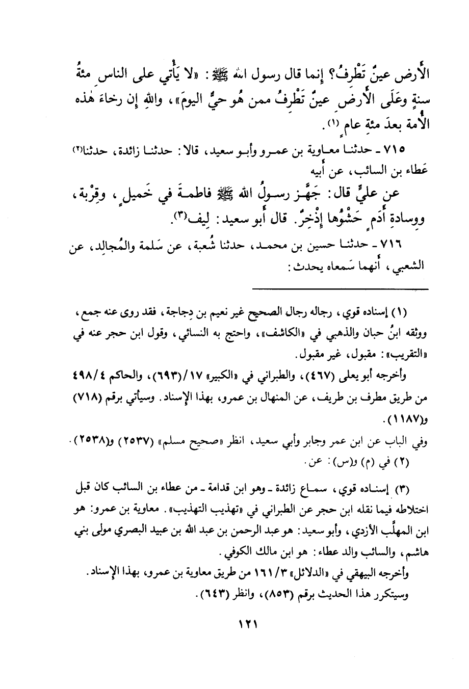 ٧١٥ - حَدَّثَنَا مُعَاوِيَةُ بْنُ عَمْرٍو، وَأَبُو سَعِيدٍ قَالا: حَدَّثَنَا زَائِدَةُ، حَدَّثَنَا (٢) عَطَاءُ بْنُ السَّائِبِ، عَنْ أَبِيهِ، عَنْ عَلِيٍّ، قَالَ: " جَهَّزَ رَسُولُ اللهِ صَلَّى اللهُ عَلَيْهِ وَسَلَّمَ فَاطِمَةَ فِي خَمِيلٍ، وَقِرْبَةٍ، وَوِسَادَةِ أَدَمٍ حَشْوُهَا إِذْخِرٌ " قَالَ أَبُو سَعِيدٍ: لِيفٌ (٣)