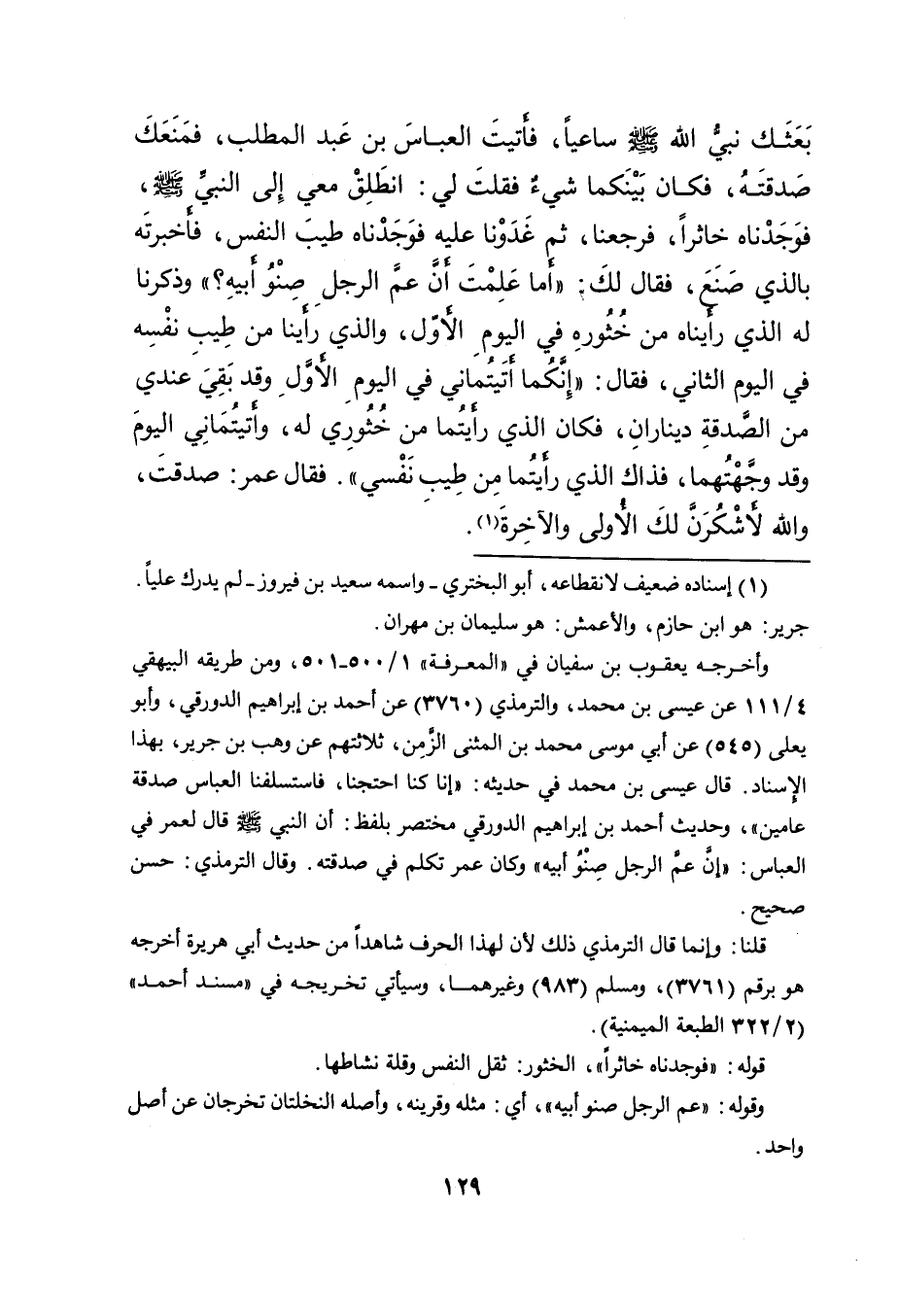 بَعَثَكَ نَبِيُّ اللهِ صَلَّى اللهُ عَلَيْهِ وَسَلَّمَ سَاعِيًا، فَأَتَيْتَ الْعَبَّاسَ بْنَ عَبْدِ الْمُطَّلِبِ، فَمَنَعَكَ صَدَقَتَهُ، فَكَانَ بَيْنَكُمَا شَيْءٌ فَقُلْتَ لِي: انْطَلِقْ مَعِي إِلَى النَّبِيِّ صَلَّى اللهُ عَلَيْهِ وَسَلَّمَ، فَوَجَدْنَاهُ خَاثِرًا، فَرَجَعْنَا، ثُمَّ غَدَوْنَا عَلَيْهِ فَوَجَدْنَاهُ طَيِّبَ النَّفْسِ، فَأَخْبَرْتَهُ بِالَّذِي صَنَعَ، فَقَالَ لَكَ: " أَمَا عَلِمْتَ أَنَّ عَمَّ الرَّجُلِ صِنْوُ أَبِيهِ؟ " وَذَكَرْنَا لَهُ الَّذِي رَأَيْنَاهُ مِنْ خُثُورِهِ فِي الْيَوْمِ الْأَوَّلِ، وَالَّذِي رَأَيْنَاهُ مِنْ طِيبِ نَفْسِهِ فِي الْيَوْمِ الثَّانِي، فَقَالَ: " إِنَّكُمَا أَتَيْتُمَانِي فِي الْيَوْمِ الْأَوَّلِ وَقَدْ بَقِيَ عِنْدِي مِنَ الصَّدَقَةِ دِينَارَانِ، فَكَانَ الَّذِي رَأَيْتُمَا مِنْ خُثُورِي لَهُ، وَأَتَيْتُمَانِي الْيَوْمَ وَقَدْ وَجَّهْتُهُمَا، فَذَاكَ الَّذِي رَأَيْتُمَا مِنْ طِيبِ نَفْسِي " فَقَالَ عُمَرُ: صَدَقْتَ، وَاللهِ لاشْكُرَنَّ لَكَ الْأُولَى وَالْآخِرَةَ (١)