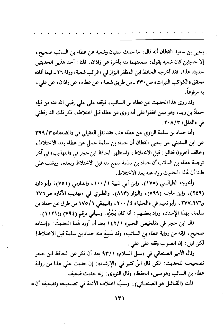 = يحيى بن سعيد القطان أنه قال: ما حدت سفيان وشعبة عن عطاء بن السائب صحيح، إلا حديثين كان شعبة يقول: سمعتهما منه بأخرة عن زاذان. قلنا: أحد هذين الحديثين حديثنا هذا، فقد أخرجه الحافظ ابن المظفر البزاز في "غرائب شعبة" ورقة ٢٦- فيما أفاده محقق "الكواكب النيرات" ص ٣٣٠- من طريق شعبة، عن عطاء، عن زاذان، عن علي، به مرفوعاً.