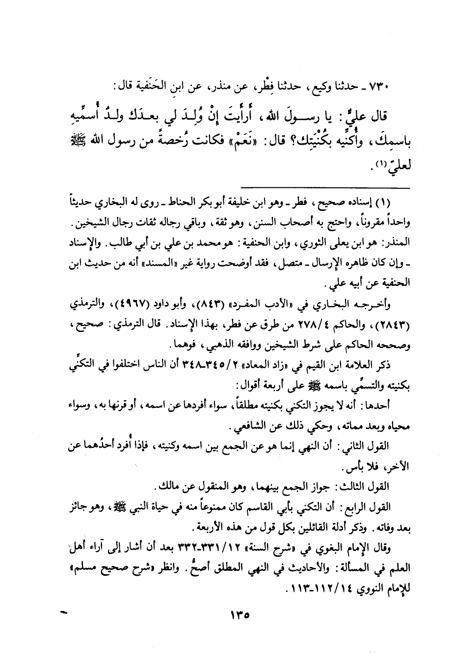 ٧٣٠ - حَدَّثَنَا وَكِيعٌ، حَدَّثَنَا فِطْرٌ، عَنِ مُنْذِرٍ، عَنِ ابْنِ الْحَنَفِيَّةِ، قَالَ: قَالَ عَلِيٌّ، يَا رَسُولَ اللهِ أَرَأَيْتَ " إِنْ وُلِدَ لِي بَعْدَكَ وَلَدٌ أُسَمِّيهِ بِاسْمِكَ، وَأُكَنِّيهِ بِكُنْيَتِكَ؟ قَالَ: " نَعَمْ " فَكَانَتْ رُخْصَةً مِنْ رَسُولِ اللهِ صَلَّى اللهُ عَلَيْهِ وَسَلَّمَ لِعَلِيٍّ (١)