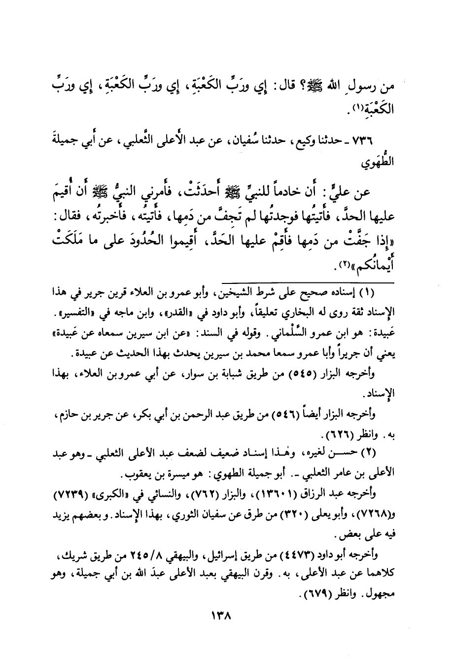 ٧٣٦ - حَدَّثَنَا وَكِيعٌ، حَدَّثَنَا سُفْيَانُ، عَنْ عَبْدِ الْأَعْلَى الثَّعْلَبِيِّ، عَنْ أَبِي جَمِيلَةَ الطُّهَوِيِّ، عَنْ عَلِيٍّ، أَنَّ خَادِمًا لِلنَّبِيِّ صَلَّى اللهُ عَلَيْهِ وَسَلَّمَ أَحْدَثَتْ، فَأَمَرَنِي النَّبِيُّ صَلَّى اللهُ عَلَيْهِ وَسَلَّمَ أَنْ أُقِيمَ عَلَيْهَا الْحَدَّ، فَأَتَيْتُهَا فَوَجَدْتُهَا لَمْ تَجِفَّ مِنْ دَمِهَا، فَأَتَيْتُهُ، فَأَخْبَرْتُهُ فَقَالَ: " إِذَا جَفَّتْ مِنْ دَمِهَا فَأَقِمْ عَلَيْهَا الْحَدَّ، أَقِيمُوا الْحُدُودَ عَلَى مَا مَلَكَتْ أَيْمَانُكُمْ " (٢)