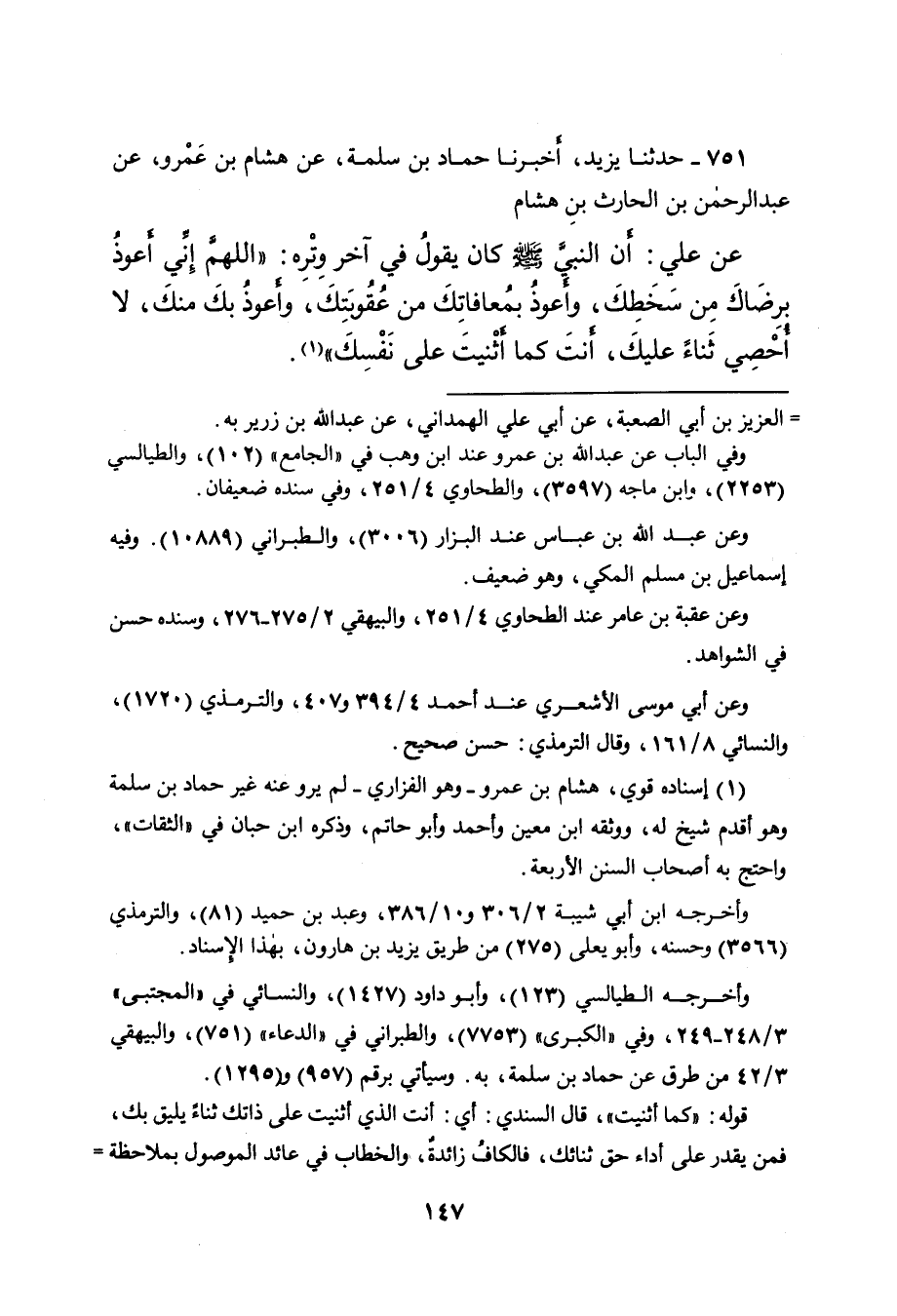 ٧٥١ - حَدَّثَنَا يَزِيدُ، أَخْبَرَنَا حَمَّادُ بْنُ سَلَمَةَ، عَنْ هِشَامِ بْنِ عَمْرٍو، عَنْ عَبْدِ الرَّحْمَنِ بْنِ الْحَارِثِ بْنِ هِشَامٍ، عَنْ عَلِيٍّ، أَنَّ النَّبِيَّ صَلَّى اللهُ عَلَيْهِ وَسَلَّمَ كَانَ يَقُولُ فِي آخِرِ وِتْرِهِ: " اللهُمَّ إِنِّي أَعُوذُ بِرِضَاكَ مِنْ سَخَطِكَ، وَأَعُوذُ بِمُعَافَاتِكَ مِنْ عُقُوبَتِكَ، وَأَعُوذُ بِكَ مِنْكَ، لَا أُحْصِي ثَنَاءً عَلَيْكَ، أَنْتَ كَمَا أَثْنَيْتَ عَلَى نَفْسِكَ " (١)