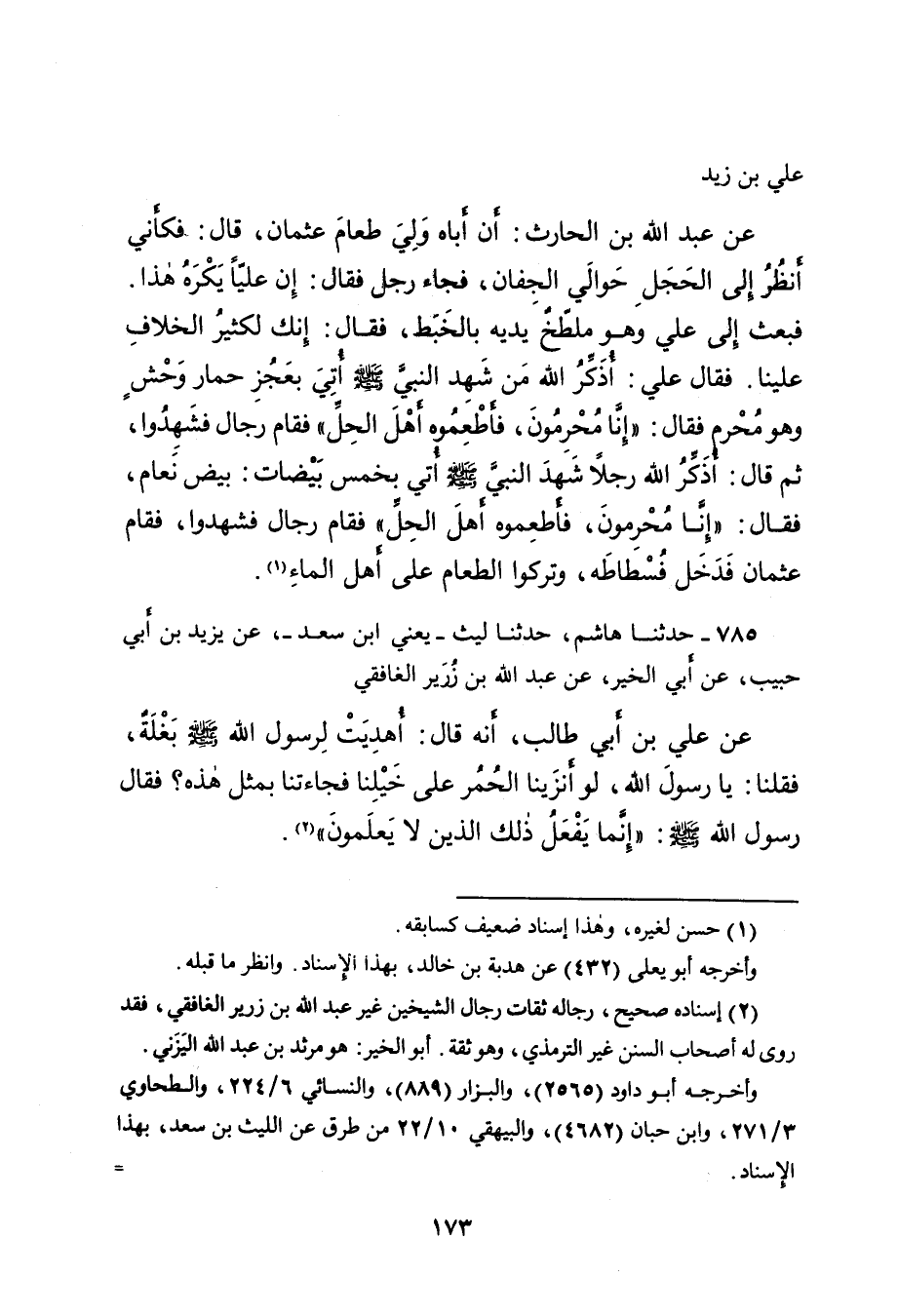 عَلِيُّ بْنُ زَيْدٍ، عَنْ عَبْدِ اللهِ بْنِ الْحَارِثِ، أَنَّ أَبَاهُ وَلِيَ طَعَامَ عُثْمَانَ، قَالَ: فَكَأَنِّي أَنْظُرُ إِلَى الْحَجَلِ حَوَالَيِ الْجِفَانِ، فَجَاءَ رَجُلٌ فَقَالَ: إِنَّ عَلِيًّا يَكْرَهُ هَذَا. فَبَعَثَ إِلَى عَلِيٍّ وَهُوَ مُلَطِّخٌ يَدَيْهِ بِالْخَبَطِ، فَقَالَ: إِنَّكَ لَكَثِيرُ الْخِلافِ عَلَيْنَا، فَقَالَ عَلِيٌّ: أُذَكِّرُ اللهَ مَنْ شَهِدَ النَّبِيَّ صَلَّى اللهُ عَلَيْهِ وَسَلَّمَ أُتِيَ بِعَجُزِ حِمَارِ وَحْشٍ وَهُوَ مُحْرِمٌ فَقَالَ: " إِنَّا مُحْرِمُونَ، فَأَطْعِمُوهُ أَهْلَ الْحِلِّ " فَقَامَ رِجَالٌ فَشَهِدُوا، ثُمَّ قَالَ: أُذَكِّرُ اللهَ رَجُلًا شَهِدَ النَّبِيَّ صَلَّى اللهُ عَلَيْهِ وَسَلَّمَ أُتِيَ بِخَمْسِ بِيضَاتٍ: بَيْضِ نَعَامٍ، فَقَالَ: " إِنَّا مُحْرِمُونَ، فَأَطْعِمُوهُ أَهْلَ الْحِلِّ " فَقَامَ رِجَالٌ فَشَهِدُوا فَقَامَ عُثْمَانُ فَدَخَلَ فُسْطَاطَهُ، وَتَرَكُوا الطَّعَامَ عَلَى أَهْلِ الْمَاءِ (١)