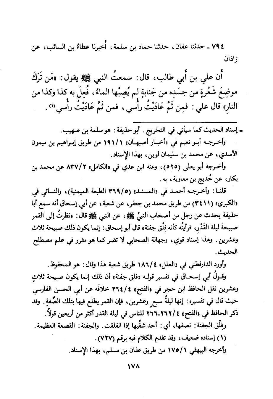 ٧٩٤ - حَدَّثَنَا عَفَّانُ، حَدَّثَنَا حَمَّادُ بْنُ سَلَمَةَ، أَخْبَرَنَا عَطَاءُ بْنُ السَّائِبِ، عَنْ زَاذَانَ، أَنَّ عَلِيَّ بْنَ أَبِي طَالِبٍ، قَالَ: سَمِعْتُ النَّبِيَّ صَلَّى اللهُ عَلَيْهِ وَسَلَّمَ يَقُولُ: " مَنْ تَرَكَ مَوْضِعَ شَعَرَةٍ مِنْ جَسَدِهِ مِنْ جَنَابَةٍ لَمْ يُصِبْهَا الْمَاءُ، فُعِلَ بِهِ كَذَا وَكَذَا مِنَ النَّارِ " قَالَ عَلِيٌّ: " فَمِنْ ثَمَّ عَادَيْتُ رَأْسِي فَمِنْ ثَمَّ عَادَيْتُ رَأْسِي " (١)