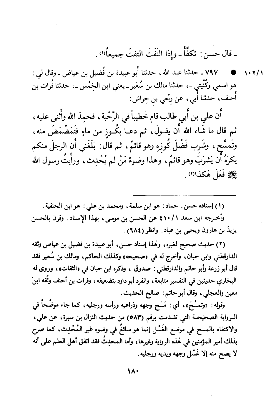 • ٧٩٧ - حَدَّثَنَا عَبْدُ اللهِ، حَدَّثَنَا أَبُو عُبَيْدَةَ بْنُ فُضَيْلِ بْنِ عِيَاضٍ، - وَقَالَ لِي: هُوَ اسْمِي وَكُنْيَتِي - حَدَّثَنَا مَالِكُ بْنُ سُعَيْرٍ يَعْنِي ابْنَ الْخِمْسِ، حَدَّثَنَا فُرَاتُ بْنُ أَحْنَفَ، حَدَّثَنَا أَبِي، عَنْ رِبْعِيِّ بْنِ حِرَاشٍ، أَنَّ عَلِيَّ بْنَ أَبِي طَالِبٍ، قَامَ خَطِيبًا فِي الرَّحَبَةِ، فَحَمِدَ اللهَ وَأَثْنَى عَلَيْهِ، ثُمَّ قَالَ: مَا شَاءَ اللهُ أَنْ يَقُولَ ثُمَّ " دَعَا بِكُوزٍ مِنْ مَاءٍ فَتَمَضْمَضَ مِنْهُ، وَتَمَسَّحَ، وَشَرِبَ فَضْلَ كُوزِهِ وَهُوَ قَائِمٌ، ثُمَّ قَالَ: بَلَغَنِي أَنَّ الرَّجُلَ مِنْكُمْ يَكْرَهُ، أَنْ يَشْرَبَ وَهُوَ قَائِمٌ، وَهَذَا وُضُوءُ مَنْ لَمْ يُحْدِثْ وَرَأَيْتُ رَسُولَ اللهِ صَلَّى اللهُ عَلَيْهِ وَسَلَّمَ فَعَلَ هَكَذَا " (٢)