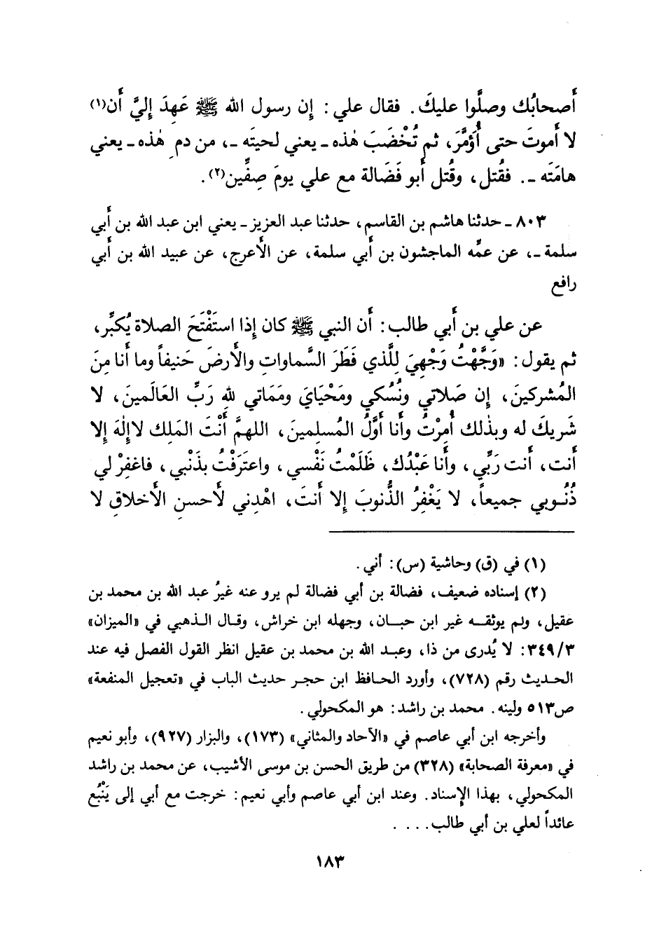 ٨٠٣ - حَدَّثَنَا هَاشِمُ بْنُ الْقَاسِمِ، حَدَّثَنَا عَبْدُ الْعَزِيزِ يَعْنِي ابْنَ عَبْدِ اللهِ بْنِ أَبِي سَلَمَةَ، عَنْ عَمِّهِ الْمَاجِشُونِ بْنِ أَبِي سَلَمَةَ، عَنِ الْأَعْرَجِ، عَنْ عُبَيْدِ اللهِ بْنِ أَبِي رَافِعٍ، عَنْ عَلِيِّ بْنِ أَبِي طَالِبٍ، أَنَّ النَّبِيَّ صَلَّى اللهُ عَلَيْهِ وَسَلَّمَ كَانَ إِذَا اسْتَفْتَحَ الصَّلاةَ يُكَبِّرُ، ثُمَّ يَقُولُ: " وَجَّهْتُ وَجْهِي لِلَّذِي فَطَرَ السَّمَوَاتِ وَالْأَرْضَ حَنِيفًا، وَمَا أَنَا مِنَ الْمُشْرِكِينَ، إِنَّ صَلاتِي وَنُسُكِي وَمَحْيَايَ وَمَمَاتِي لِلَّهِ رَبِّ الْعَالَمِينَ، لَا شَرِيكَ لَهُ وَبِذَلِكَ أُمِرْتُ وَأَنَا أَوَّلُ الْمُسْلِمِينَ، اللهُمَّ أَنْتَ الْمَلِكُ لَا إِلَهَ إِلا أَنْتَ، أَنْتَ رَبِّي، وَأَنَا عَبْدُكَ ظَلَمْتُ نَفْسِي، وَاعْتَرَفْتُ بِذَنْبِي، فَاغْفِرْ لِي ذُنُوبِي جَمِيعًا، لَا يَغْفِرُ الذُّنُوبَ إِلا أَنْتَ، اللهُمَّ اهْدِنِي لِأَحْسَنِ الْأَخْلاقِ لَا