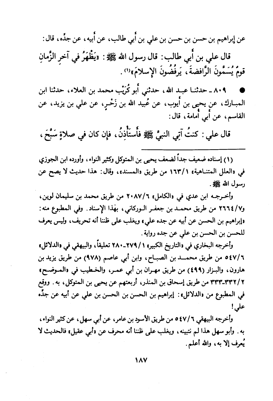 عَنْ إِبْرَاهِيمَ بْنِ حَسَنِ بْنِ حَسَنِ بْنِ عَلِيِّ بْنِ أَبِي طَالِبٍ، عَنْ أَبِيهِ، عَنْ جَدِّهِ، قَالَ: قَالَ عَلِيُّ بْنُ أَبِي طَالِبٍ، قَالَ رَسُولُ اللهِ صَلَّى اللهُ عَلَيْهِ وَسَلَّمَ: " يَظْهَرُ فِي آخِرِ الزَّمَانِ قَوْمٌ يُسَمَّوْنَ الرَّافِضَةَ يَرْفُضُونَ الْإِسْلامَ " (١)