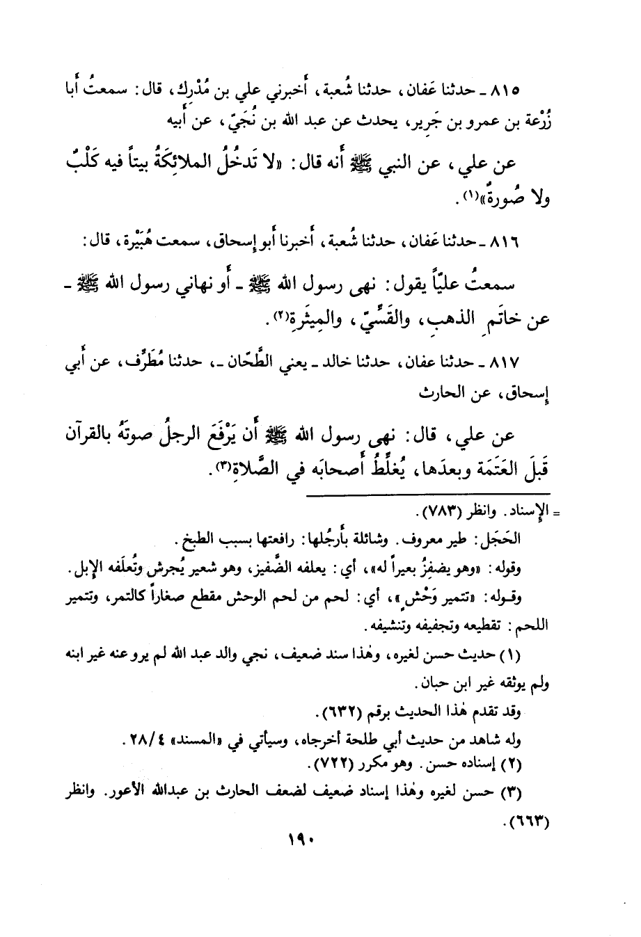 ٨١٧ - حَدَّثَنَا عَفَّانُ، حَدَّثَنَا خَالِدٌ يَعْنِي الطَّحَّانَ، حَدَّثَنَا مُطَرِّفٌ، عَنْ أَبِي إِسْحَاقَ، عَنِ الْحَارِثِ، عَنْ عَلِيٍّ، قَالَ: " نَهَى رَسُولُ اللهِ صَلَّى اللهُ عَلَيْهِ وَسَلَّمَ أَنْ يَرْفَعَ الرَّجُلُ صَوْتَهُ بِالْقُرْآنِ قَبْلَ الْعَتَمَةِ وَبَعْدَهَا، يُغَلِّطُ أَصْحَابَهُ فِي الصَّلاةِ " (٣)