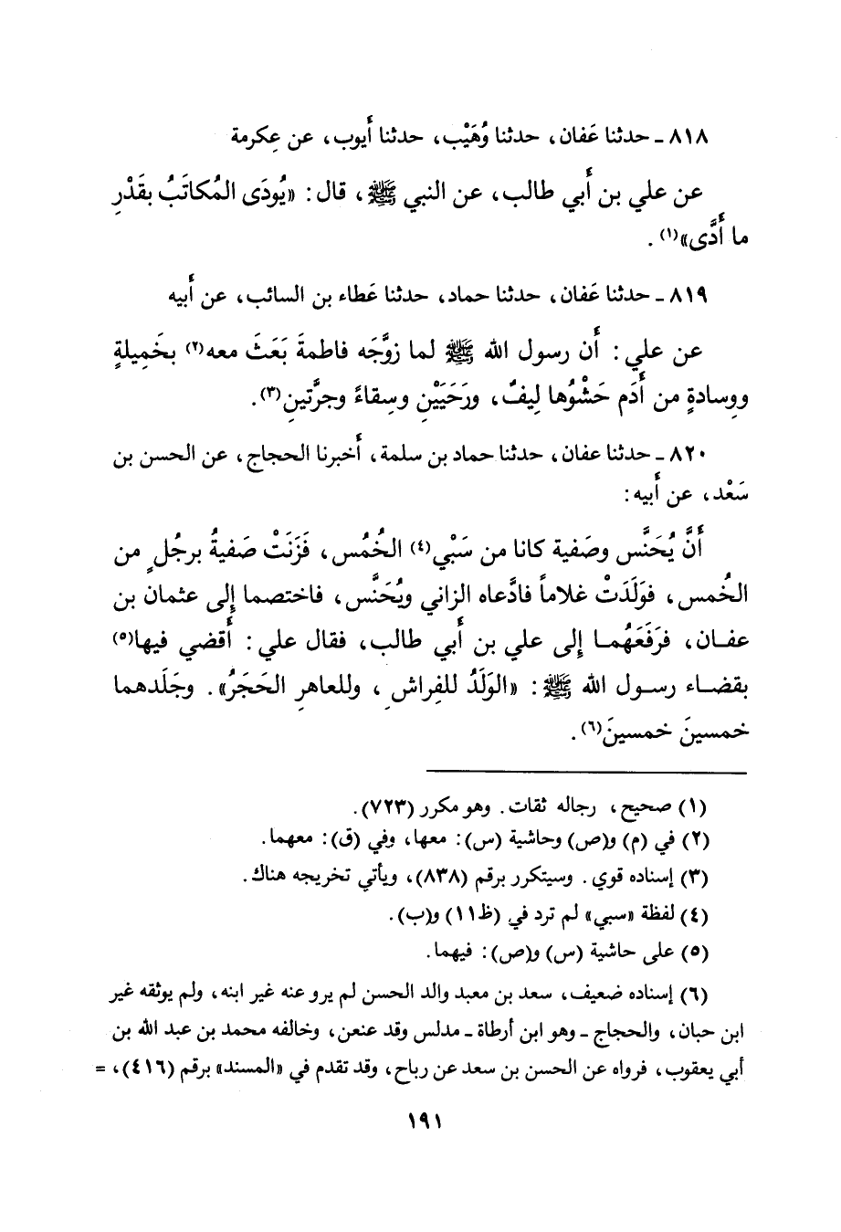 ٨٢٠ - حَدَّثَنَا عَفَّانُ، حَدَّثَنَا حَمَّادُ بْنُ سَلَمَةَ، أَخْبَرَنَا الْحَجَّاجُ، عَنِ الْحَسَنِ بْنِ سَعْدٍ، عَنْ أَبِيهِ، أَنَّ يُحَنَّسَ، وَصَفِيَّةَ، كَانَا مِنْ سَبْيِ (٤) الْخُمُسِ، فَزَنَتْ صَفِيَّةُ بِرَجُلٍ مِنَ الْخُمُسِ، فَوَلَدَتْ غُلامًا فَادَّعَاهُ الزَّانِي وَيُحَنَّسُ، فَاخْتَصَمَا إِلَى عُثْمَانَ بْنِ عَفَّانَ، فَرَفَعَهُمَا إِلَى عَلِيِّ بْنِ أَبِي طَالِبٍ، فَقَالَ عَلِيٌّ: أَقْضِي فِيهِا (٥) بِقَضَاءِ رَسُولِ اللهِ صَلَّى اللهُ عَلَيْهِ وَسَلَّمَ: " الْوَلَدُ لِلْفِرَاشِ، وَلِلْعَاهِرِ الْحَجَرُ ". وَجَلَدَهُمَا خَمْسِينَ خَمْسِينَ (٦)