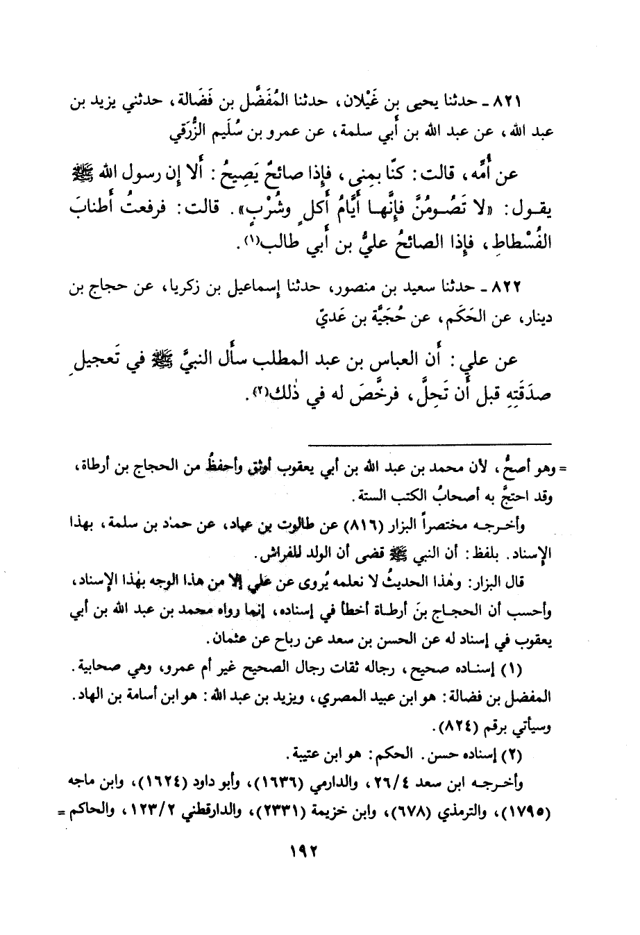 ٨٢٢ - حَدَّثَنَا سَعِيدُ بْنُ مَنْصُورٍ، حَدَّثَنَا إِسْمَاعِيلُ بْنُ زَكَرِيَّا، عَنْ حَجَّاجِ بْنِ دِينَارٍ، عَنِ الْحَكَمِ، عَنْ حُجَيَّةَ بْنِ عَدِيٍّ، عَنْ عَلِيٍّ: أَنَّ الْعَبَّاسَ بْنَ عَبْدِ الْمُطَّلِبِ، " سَأَلَ النَّبِيَّ صَلَّى اللهُ عَلَيْهِ وَسَلَّمَ فِي تَعْجِيلِ صَدَقَتِهِ قَبْلَ أَنْ تَحِلَّ، فَرَخَّصَ لَهُ فِي ذَلِك " (٢)