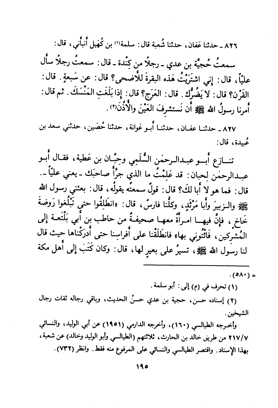 ٨٢٧ - حَدَّثَنَا عَفَّانُ، حَدَّثَنَا أَبُو عَوَانَةَ، حَدَّثَنَا حُصَيْنٌ، حَدَّثَنِي سَعْدُ بْنُ عُبَيْدَةَ، قَالَ: تَنَازَعَ أَبُو عَبْدِ الرَّحْمَنِ السُّلَمِيُّ وَحِبَّانُ بْنُ عَطِيَّةَ، فَقَالَ: أَبُو عَبْدِ الرَّحْمَنِ لِحِبَّانَ: قَدْ عَلِمْتُ مَا الَّذِي جَرَّأَ صَاحِبَكَ - يَعْنِي عَلِيًّا - قَالَ: فَمَا هُوَ لَا أَبَا لَكَ؟ قَالَ: قَوْلٌ سَمِعْتُهُ يَقُولُهُ، قَالَ: بَعَثَنِي رَسُولُ اللهِ صَلَّى اللهُ عَلَيْهِ وَسَلَّمَ وَالزُّبَيْرَ، وَأَبَا مَرْثَدٍ، وَكُلُّنَا فَارِسٌ، قَالَ: " انْطَلِقُوا حَتَّى تَبْلُغُوا رَوْضَةَ خَاخٍ، فَإِنَّ فِيهَا امْرَأَةً مَعَهَا صَحِيفَةٌ مِنْ حَاطِبِ بْنِ أَبِي بَلْتَعَةَ إِلَى الْمُشْرِكِينَ، فَأْتُونِي بِهَا " فَانْطَلَقْنَا عَلَى أَفْرَاسِنَا حَتَّى أَدْرَكْنَاهَا حَيْثُ قَالَ: لَنَا رَسُولُ اللهِ صَلَّى اللهُ عَلَيْهِ وَسَلَّمَ، تَسِيرُ عَلَى بَعِيرٍ لَهَا، قَالَ: وَكَانَ كَتَبَ إِلَى أَهْلِ مَكَّةَ