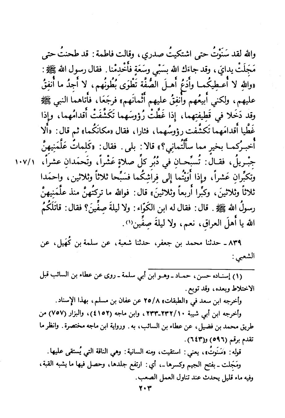وَاللهِ لَقَدْ سَنَوْتُ حَتَّى اشْتَكَيْتُ صَدْرِي، وَقَالَتْ فَاطِمَةُ: قَدْ طَحَنْتُ حَتَّى مَجَلَتْ يَدَايَ، وَقَدْ جَاءَكَ اللهُ بِسَبْيٍ وَسَعَةٍ فَأَخْدِمْنَا، فَقَالَ رَسُولُ اللهِ صَلَّى اللهُ عَلَيْهِ وَسَلَّمَ: " وَاللهِ لَا أُعْطِيكُمَا وَأَدَعُ أَهْلَ الصُّفَّةِ تَطْوَى بُطُونُهُمْ، لَا أَجِدُ مَا أُنْفِقُ عَلَيْهِمْ، وَلَكِنِّي أَبِيعُهُمْ وَأُنْفِقُ عَلَيْهِمْ أَثْمَانَهُمْ " فَرَجَعَا، فَأَتَاهُمَا النَّبِيُّ صَلَّى اللهُ عَلَيْهِ وَسَلَّمَ وَقَدْ دَخَلَا فِي قَطِيفَتِهِمَا، إِذَا غَطَّتْ رُءُوسَهُمَا تَكَشَّفَتْ أَقْدَامُهُمَا، وَإِذَا غَطَّيَا أَقْدَامَهُمَا تَكَشَّفَتْ رُءُوسُهُمَا، فَثَارَا، فَقَالَ: " مَكَانَكُمَا " ثُمَّ قَالَ: " أَلَا أُخْبِرُكُمَا بِخَيْرٍ مِمَّا سَأَلْتُمَانِي؟ " قَالَا: بَلَى. فَقَالَ: " كَلِمَاتٌ عَلَّمَنِيهِنَّ جِبْرِيلُ "، فَقَالَ: " تُسَبِّحَانِ فِي دُبُرِ كُلِّ صَلَاةٍ عَشْرًا، وَتَحْمَدَانِ عَشْرًا، وَتُكَبِّرَانِ عَشْرًا، وَإِذَا أَوَيْتُمَا إِلَى فِرَاشِكُمَا فَسَبِّحَا ثَلَاثًا وَثَلَاثِينَ، وَاحْمَدَا ثَلَاثًا وَثَلَاثِينَ، وَكَبِّرَا أَرْبَعًا وَثَلَاثِينَ " قَالَ: " فَوَ اللهِ مَا تَرَكْتُهُنَّ مُنْذُ عَلَّمَنِيهِنَّ رَسُولُ اللهِ صَلَّى اللهُ عَلَيْهِ وَسَلَّمَ " قَالَ: فَقَالَ لَهُ ابْنُ الْكَوَّاءِ: وَلَا لَيْلَةَ صِفِّينَ؟ فَقَالَ: " قَاتَلَكُمِ اللهُ يَا أَهْلَ الْعِرَاقِ، نَعَمْ، وَلَا لَيْلَةَ صِفِّينَ " (١)