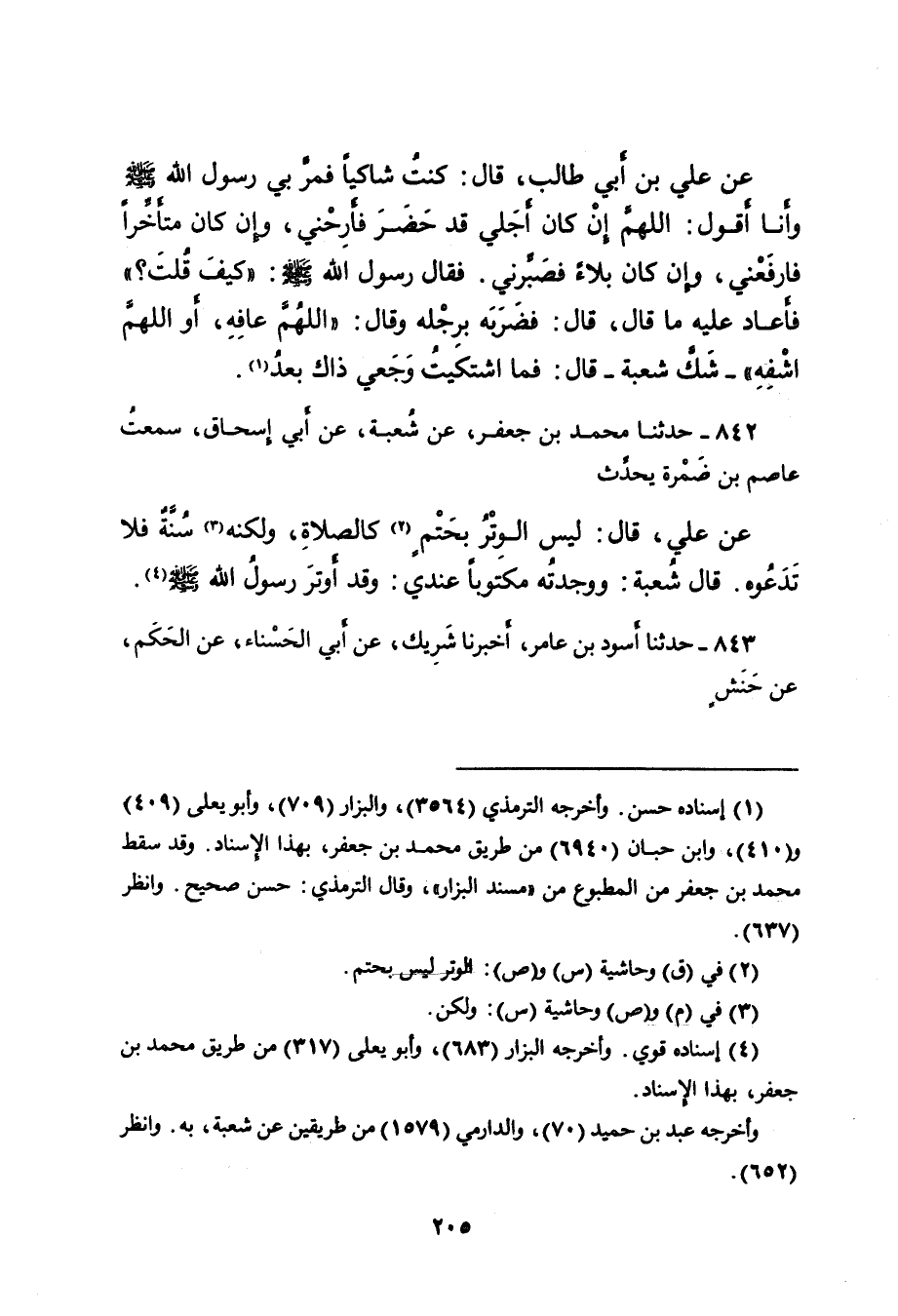 ٨٤٢ - حَدَّثَنَا مُحَمَّدُ بْنُ جَعْفَرٍ، عَنْ شُعْبَةَ، عَنْ أَبِي إِسْحَاقَ، سَمِعْتُ عَاصِمَ بْنَ ضَمْرَةَ، يُحَدِّثُ عَنْ عَلِيٍّ، قَالَ: " لَيْسَ الْوَتْرُ بِحَتْمٍ (٢) كَالصَّلَاةِ، وَلَكِنَّهُ (٣) سُنَّةٌ فَلَا تَدَعُوهُ " قَالَ شُعْبَةُ: " وَوَجَدْتُهُ مَكْتُوبًا عِنْدِي: وَقَدْ أَوْتَرَ رَسُولُ اللهِ صَلَّى اللهُ عَلَيْهِ وَسَلَّمَ " (٤)