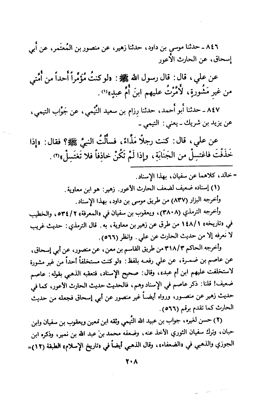 ٨٤٦ - حَدَّثَنَا مُوسَى بْنُ دَاوُدَ، حَدَّثَنَا زُهَيْرٌ، عَنْ مَنْصُورِ بْنِ الْمُعْتَمِرِ، عَنْ أَبِي إِسْحَاقَ، عَنِ الْحَارِثِ الْأَعْوَرِ، عَنْ عَلِيٍّ، قَالَ: قَالَ رَسُولُ اللهِ صَلَّى اللهُ عَلَيْهِ وَسَلَّمَ: " لَوْ كُنْتُ مُؤَمِّرًا أَحَدًا مِنْ أُمَّتِي مِنْ غَيْرِ مَشُورَةٍ، لَأَمَّرْتُ عَلَيْهِمُ ابْنَ أُمِّ عَبْدٍ " (١)