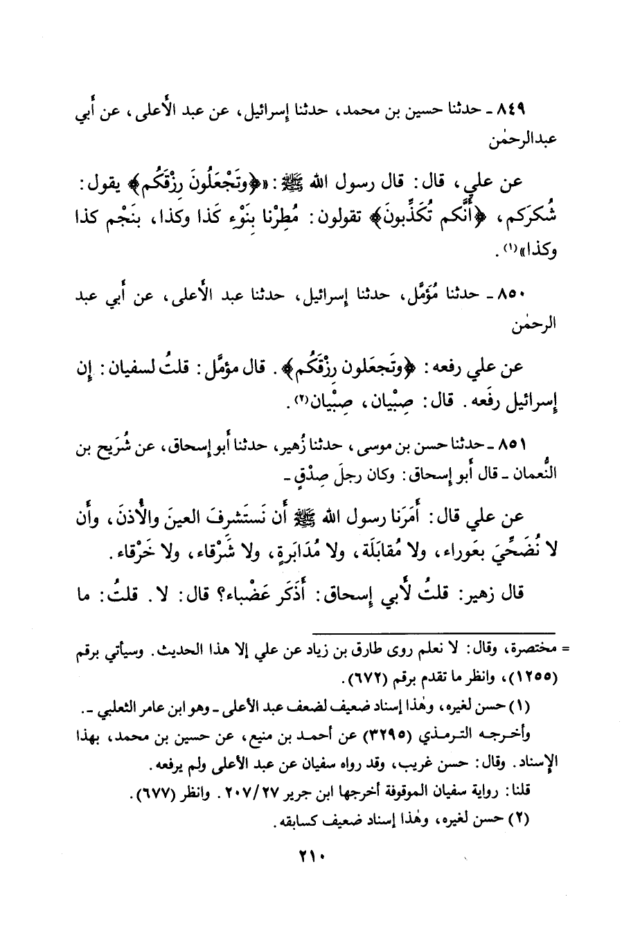 ٨٤٩ - حَدَّثَنَا حُسَيْنُ بْنُ مُحَمَّدٍ، حَدَّثَنَا إِسْرَائِيلُ، عَنْ عَبْدِ الْأَعْلَى، عَنْ أَبِي عَبْدِ الرَّحْمَنِ، عَنْ عَلِيٍّ، قَالَ: قَالَ رَسُولُ اللهِ صَلَّى اللهُ عَلَيْهِ وَسَلَّمَ: {وَتَجْعَلُونَ رِزْقَكُمْ} [الواقعة: ٨٢] يَقُولُ: " شُكْرَكُمْ "، {أَنَّكُمْ تُكَذِّبُونَ} [الواقعة: ٨٢] تَقُولُونَ: " مُطِرْنَا بِنَوْءِ كَذَا وَكَذَا بِنَجْمِ كَذَا وَكَذَا " (١)