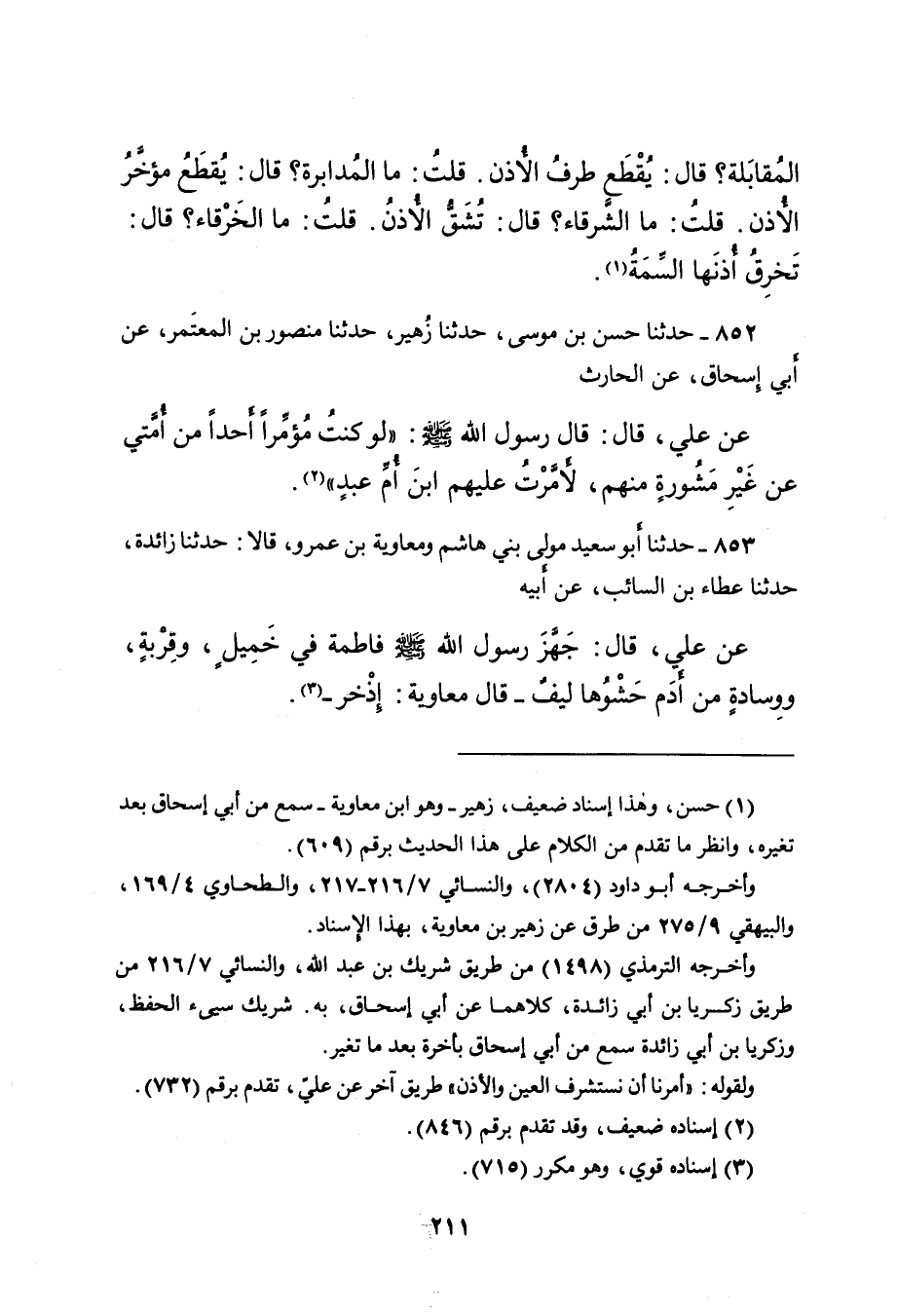٨٥٢ - حَدَّثَنَا حَسَنُ بْنُ مُوسَى، حَدَّثَنَا زُهَيْرٌ، حَدَّثَنَا مَنْصُورُ بْنُ الْمُعْتَمِرِ، عَنْ أَبِي إِسْحَاقَ، عَنْ الْحَارِثِ، عَنْ عَلِيٍّ قَالَ: قَالَ رَسُولُ اللهِ صَلَّى اللهُ عَلَيْهِ وَسَلَّمَ: " لَوْ كُنْتُ مُؤَمِّرًا أَحَدًا مِنْ أُمَّتِي عَنْ غَيْرِ مَشُورَةٍ مِنْهُمْ، لَأَمَّرْتُ عَلَيْهِمُ ابْنَ أُمِّ عَبْدٍ " (٢)