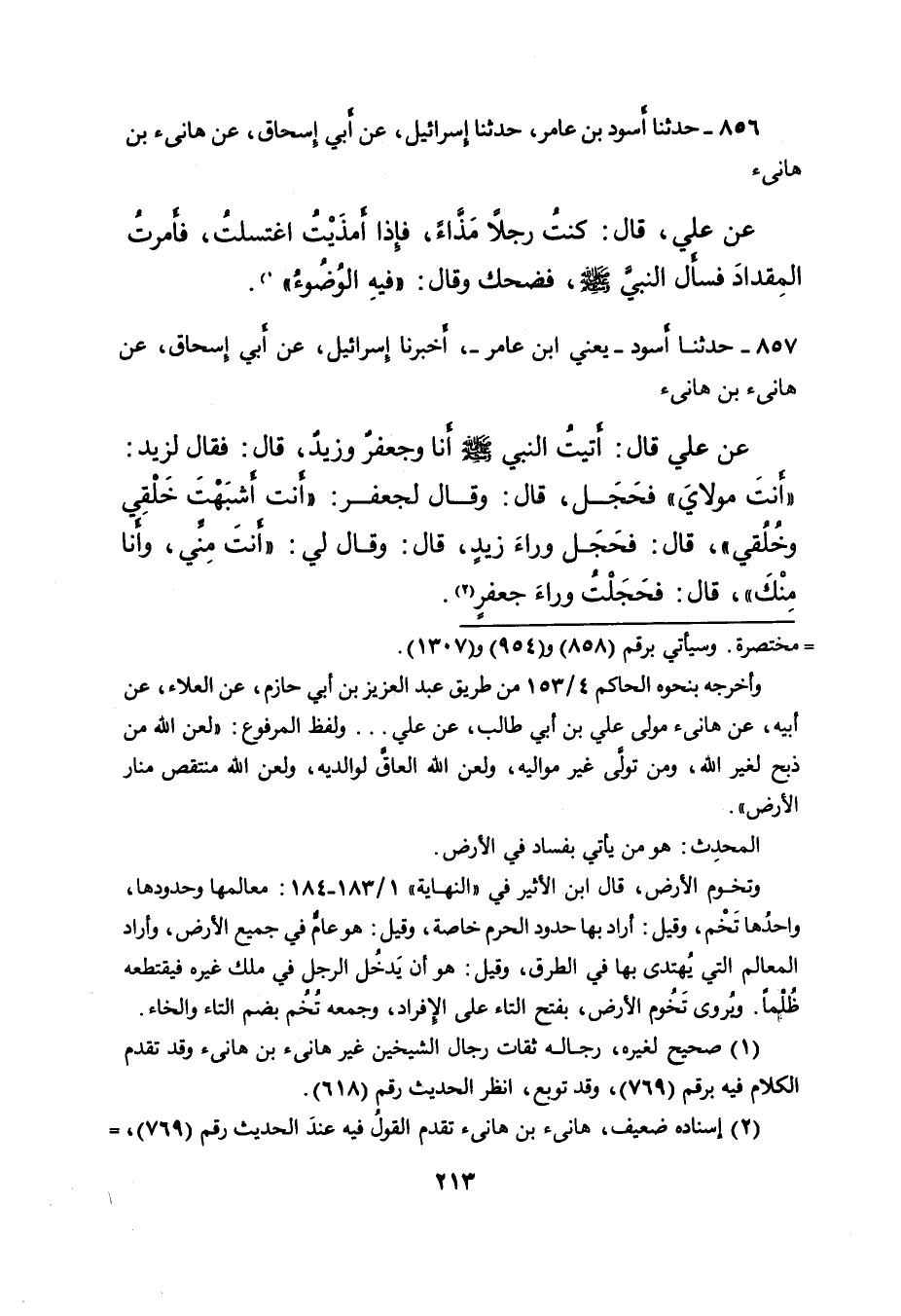 ٨٥٧ - حَدَّثَنَا أَسْوَدُ يَعْنِي ابْنَ عَامِرٍ، أَخْبَرَنَا إِسْرَائِيلُ، عَنْ أَبِي إِسْحَاقَ، عَنْ هَانِئِ بْنِ هَانِئٍ، عَنْ عَلِيٍّ، قَالَ: أَتَيْتُ النَّبِيَّ صَلَّى اللهُ عَلَيْهِ وَسَلَّمَ أَنَا وَجَعْفَرٌ، وَزَيْدٌ، قَالَ: فَقَالَ لِزَيْدٍ: " أَنْتَ مَوْلَايَ " فَحَجَلَ، قَالَ: وَقَالَ لِجَعْفَرٍ: " أَنْتَ أَشْبَهْتَ خَلْقِي وَخُلُقِي "، قَالَ: فَحَجَلَ وَرَاءَ زَيْدٍ، قَالَ: وَقَالَ لِي: " أَنْتَ مِنِّي، وَأَنَا مِنْكَ "، قَالَ: فَحَجَلْتُ وَرَاءَ جَعْفَرٍ (٢)