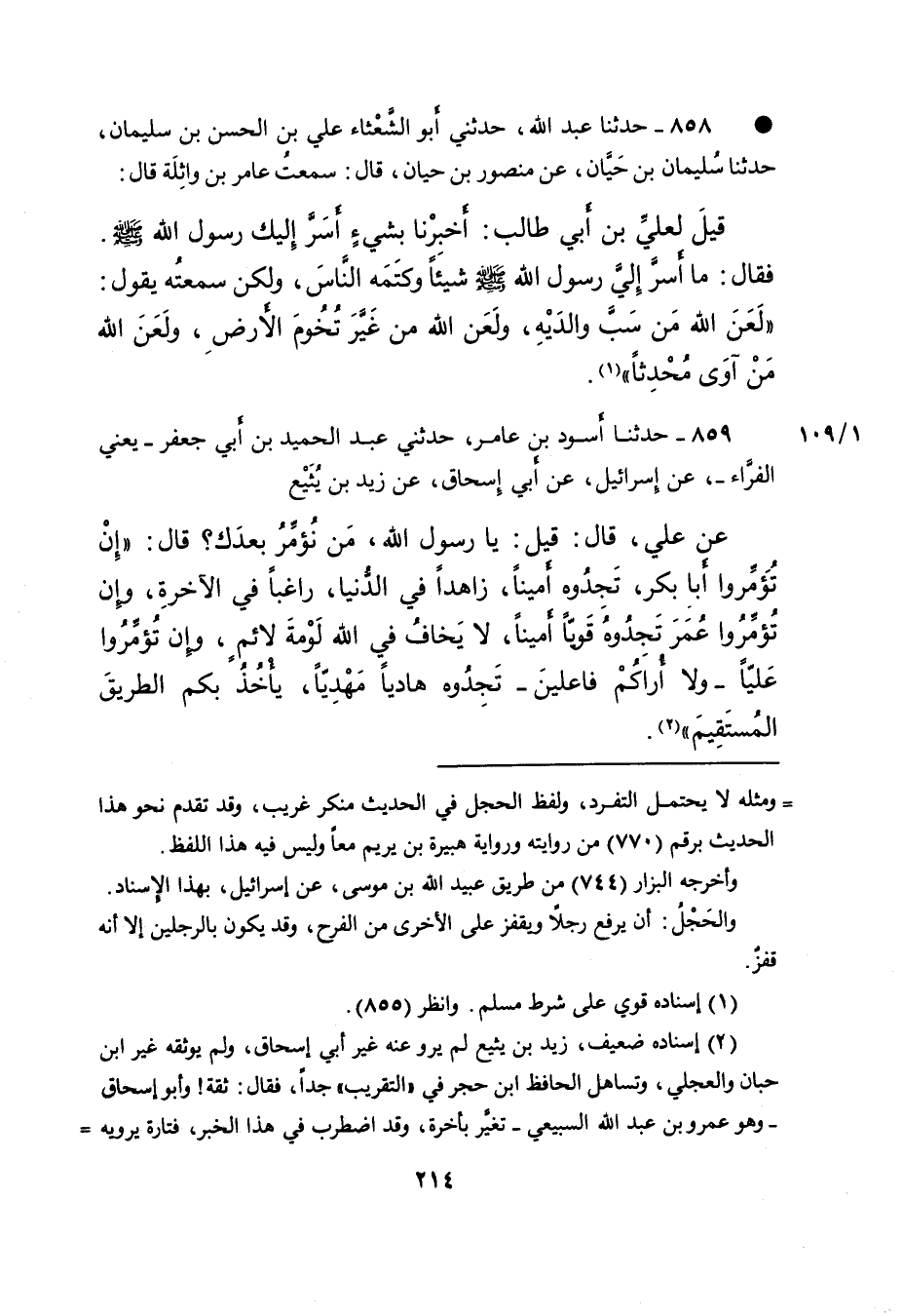 ٨٥٩ - حَدَّثَنَا أَسْوَدُ بْنُ عَامِرٍ، حَدَّثَنِي عَبْدُ الْحَمِيدِ بْنُ أَبِي جَعْفَرٍ يَعْنِي الْفَرَّاءَ، عَنْ إِسْرَائِيلَ، عَنْ أَبِي إِسْحَاقَ، عَنْ زَيْدِ بْنِ يُثَيْعٍ، عَنْ عَلِيٍّ، قَالَ: قِيلَ يَا رَسُولَ اللهِ، مَنْ نُؤَمِّرُ بَعْدَكَ؟ قَالَ: " إِنْ تُؤَمِّرُوا أَبَا بَكْرٍ، تَجِدُوهُ أَمِينًا، زَاهِدًا فِي الدُّنْيَا، رَاغِبًا فِي الْآخِرَةِ، وَإِنْ تُؤَمِّرُوا عُمَرَ تَجِدُوهُ قَوِيًّا أَمِينًا، لَا يَخَافُ فِي اللهِ لَوْمَةَ لَائِمٍ، وَإِنْ تُؤَمِّرُوا عَلِيًّا - وَلَا أُرَاكُمْ فَاعِلِينَ - تَجِدُوهُ هَادِيًا مَهْدِيًّا، يَأْخُذُ بِكُمُ الطَّرِيقَ الْمُسْتَقِيمَ " (٢)
