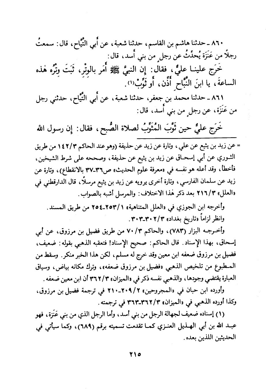 ٨٦٠ - حَدَّثَنَا هَاشِمُ بْنُ الْقَاسِمِ، حَدَّثَنَا شُعْبَةُ، عَنْ أَبِي التَّيَّاحِ، قَالَ: سَمِعْتُ رَجُلًا، مِنْ عَنَزَةَ يُحَدِّثُ عَنْ رَجُلٍ مِنْ بَنِي أَسَدٍ، قَالَ: خَرَجَ عَلَيْنَا عَلِيٌّ، فَقَالَ: " إِنَّ النَّبِيَّ صَلَّى اللهُ عَلَيْهِ وَسَلَّمَ أَمَرَ بِالْوَتْرِ، ثَبَتَ وِتْرُهُ هَذِهِ السَّاعَةَ "، يَا ابْنَ النَّبَّاحِ أَذِّنْ، أَوْ ثَوِّبْ (١)