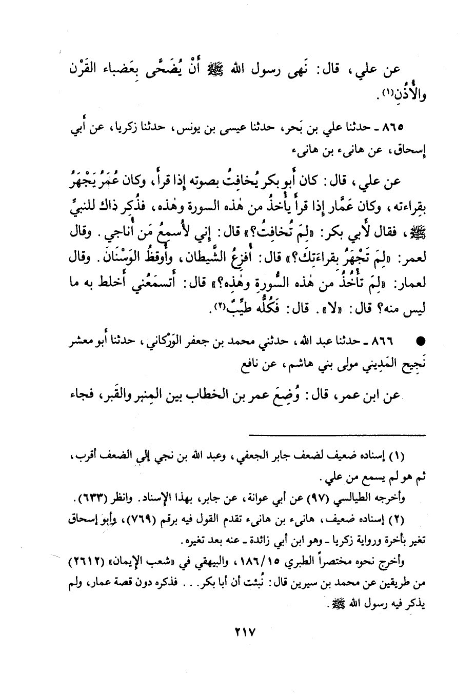 ٨٦٥ - حَدَّثَنَا عَلِيُّ بْنُ بَحْرٍ، حَدَّثَنَا عِيسَى بْنُ يُونُسَ، حَدَّثَنَا زَكَرِيَّا، عَنْ أَبِي إِسْحَاقَ، عَنْ هَانِئِ بْنِ هَانِئٍ، عَنْ عَلِيٍّ، قَالَ: كَانَ أَبُو بَكْرٍ يُخَافِتُ بِصَوْتِهِ إِذَا قَرَأَ، وَكَانَ عُمَرُ يَجْهَرُ بِقِرَاءَتِهِ، وَكَانَ عَمَّارٌ إِذَا قَرَأَ يَأْخُذُ مِنْ هَذِهِ السُّورَةِ وَهَذِهِ، فَذُكِرَ ذَاكَ لِلنَّبِيِّ صَلَّى اللهُ عَلَيْهِ وَسَلَّمَ فَقَالَ: لِأَبِي بَكْرٍ: " لِمَ تُخَافِتُ؟ " قَالَ: إِنِّي لَأُسْمِعُ مَنْ أُنَاجِي وَقَالَ لِعُمَرَ: " لِمَ تَجْهَرُ بِقِرَاءَتِكَ؟ " قَالَ: أُفْزِعُ الشَّيْطَانَ، وَأُوقِظُ الْوَسْنَانَ، وَقَالَ لِعَمَّارٍ: " وَلِمَ تَأْخُذُ مِنْ هَذِهِ السُّورَةِ وَهَذِهِ؟ " قَالَ: أَتَسْمَعُنِي أَخْلِطُ بِهِ مَا لَيْسَ مِنْهُ؟ قَالَ: " لَا " قَالَ: " فَكُلُّهُ طَيِّبٌ " (٢)