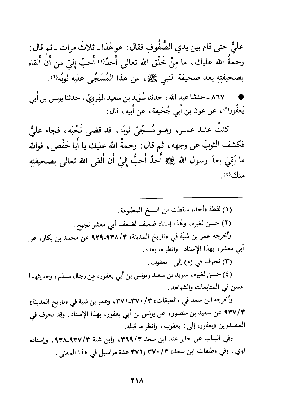 • ٨٦٧ - حَدَّثَنَا عَبْدُ اللهِ، حَدَّثَنَا سُوَيْدُ بْنُ سَعِيدٍ الْهَرَوِيُّ، حَدَّثَنَا يُونُسُ بْنُ أَبِي يَعْفُورٍ (٣) ، عَنْ عَوْنِ بْنِ أَبِي جُحَيْفَةَ، عَنْ أَبِيهِ، قَالَ: كُنْتُ عِنْدَ عُمَرَ، وَهُوَ مُسَجًّى بِثَوْبِهِ، قَدْ قَضَى نَحْبَهُ، فَجَاءَ عَلِيٌّ فَكَشَفَ الثَّوْبَ عَنْ وَجْهِهِ، ثُمَّ قَالَ: " رَحْمَةُ اللهِ عَلَيْكَ أَبَا حَفْصٍ، فَوَاللهِ مَا بَقِيَ بَعْدَ رَسُولِ اللهِ صَلَّى اللهُ عَلَيْهِ وَسَلَّمَ أَحَدٌ أَحَبُّ إِلَيَّ أَنْ أَلْقَى اللهَ تَعَالَى بِصَحِيفَتِهِ مِنْكَ " (٤)