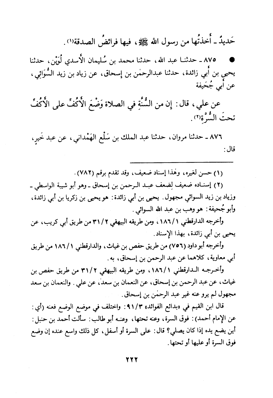 • ٨٧٥ - حَدَّثَنَا عَبْدُ اللهِ، حَدَّثَنَا مُحَمَّدُ بْنُ سُلَيْمَانَ الْأَسَدِيُّ لُوَيْنٌ، حَدَّثَنَا يَحْيَى بْنُ أَبِي زَائِدَةَ، حَدَّثَنَا عَبْدُ الرَّحْمَنِ بْنُ إِسْحَاقَ، عَنْ زِيَادِ بْنِ زَيْدٍ السُّوَائِيِّ، عَنْ أَبِي جُحَيْفَةَ، عَنْ عَلِيٍّ، قَالَ: " إِنَّ مِنَ السُّنَّةِ فِي الصَّلاةِ وَضْعُ الْأَكُفِّ، عَلَى الْأَكُفِّ تَحْتَ السُّرَّةِ " (٢)
