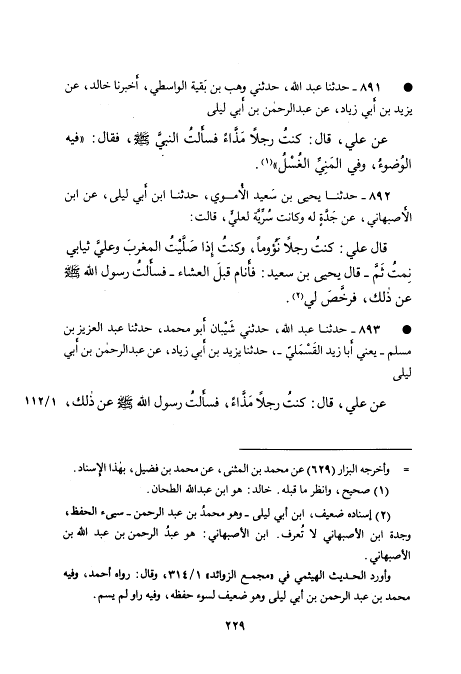 • ٨٩١ - حَدَّثَنَا عَبْدُ اللهِ، حَدَّثَنِي وَهْبُ بْنُ بَقِيَّةَ الْوَاسِطِيُّ، أَخْبَرَنَا خَالِدٌ، عَنْ يَزِيدَ بْنِ أَبِي زِيَادٍ، عَنْ عَبْدِ الرَّحْمَنِ بْنِ أَبِي لَيْلَى، عَنْ عَلِيٍّ، قَالَ: كُنْتُ رَجُلًا مَذَّاءً فَسَأَلْتُ النَّبِيَّ صَلَّى اللهُ عَلَيْهِ وَسَلَّمَ، فَقَالَ: " فِيهِ الْوُضُوءُ، وَفِي الْمَنِيِّ الْغُسْلُ " (١)