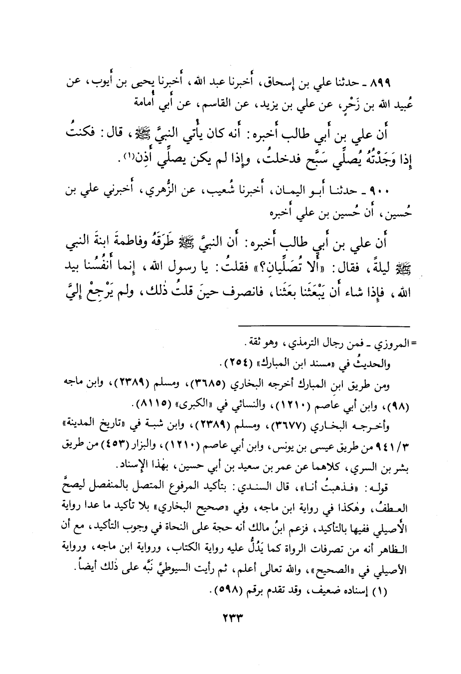 ٨٩٩ - حَدَّثَنَا عَلِيُّ بْنُ إِسْحَاقَ، أَخْبَرَنَا عَبْدُ اللهِ، أَخْبَرَنَا يَحْيَى بْنُ أَيُّوبَ، عَنْ عُبَيْدِ اللهِ بْنِ زَحْرٍ، عَنْ عَلِيِّ بْنِ يَزِيدَ، عَنْ الْقَاسِمِ، عَنْ أَبِي أُمَامَةَ، أَنَّ عَلِيَّ بْنَ أَبِي طَالِبٍ، أَخْبَرَهُ أَنَّهُ: كَانَ يَأْتِي النَّبِيَّ صَلَّى اللهُ عَلَيْهِ وَسَلَّمَ، قَالَ: " فَكُنْتُ إِذَا وَجَدْتُهُ يُصَلِّي سَبَّحَ فَدَخَلْتُ، وَإِذَا لَمْ يَكُنْ يُصَلِّي أَذِنَ " (١)