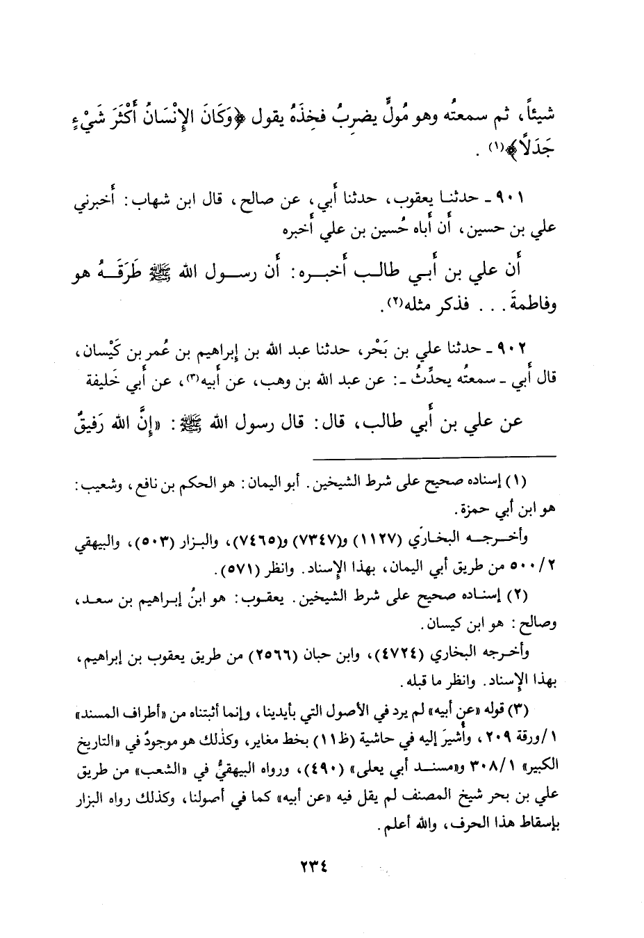 ٩٠١ - حَدَّثَنَا يَعْقُوبُ، حَدَّثَنَا أَبِي، عَنْ صَالِحٍ، قَالَ: ابْنُ شِهَابٍ، أَخْبَرَنِي عَلِيُّ بْنُ حُسَيْنٍ، أَنَّ أَبَاهُ حُسَيْنَ بْنَ عَلِيٍّ، أَخْبَرَهُ أَنَّ عَلِيَّ بْنَ أَبِي طَالِبٍ، أَخْبَرَهُ أَنَّ رَسُولَ اللهِ صَلَّى اللهُ عَلَيْهِ وَسَلَّمَ طَرَقَهُ هُوَ وَفَاطِمَةَ فَذَكَرَ مِثْلَهُ (٢)