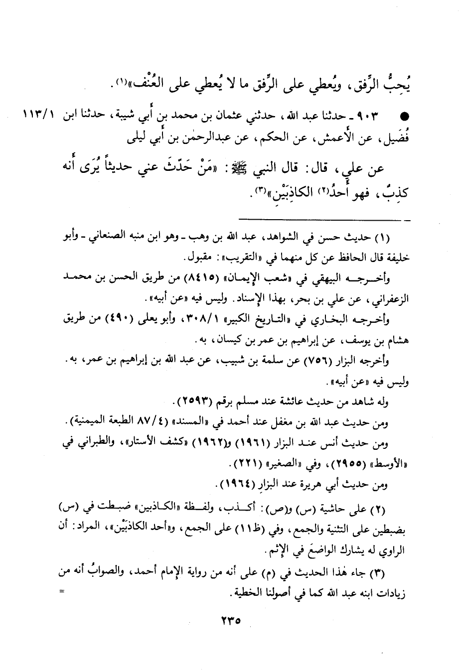 • ٩٠٣ - حَدَّثَنَا عَبْدُ اللهِ، حَدَّثَنِي عُثْمَانُ بْنُ مُحَمَّدِ بْنِ أَبِي شَيْبَةَ، حَدَّثَنَا ابْنُ فُضَيْلٍ، عَنِ الْأَعْمَشِ، عَنِ الْحَكَمِ، عَنْ عَبْدِ الرَّحْمَنِ بْنِ أَبِي لَيْلَى، عَنْ عَلِيٍّ، قَالَ: قَالَ النَّبِيُّ صَلَّى اللهُ عَلَيْهِ وَسَلَّمَ: " مَنْ حَدَّثَ عَنِّي حَدِيثًا يُرَى أَنَّهُ كَذِبٌ، فَهُوَ أَحدُ (٢) الْكَاذِبِينَ " (٣)