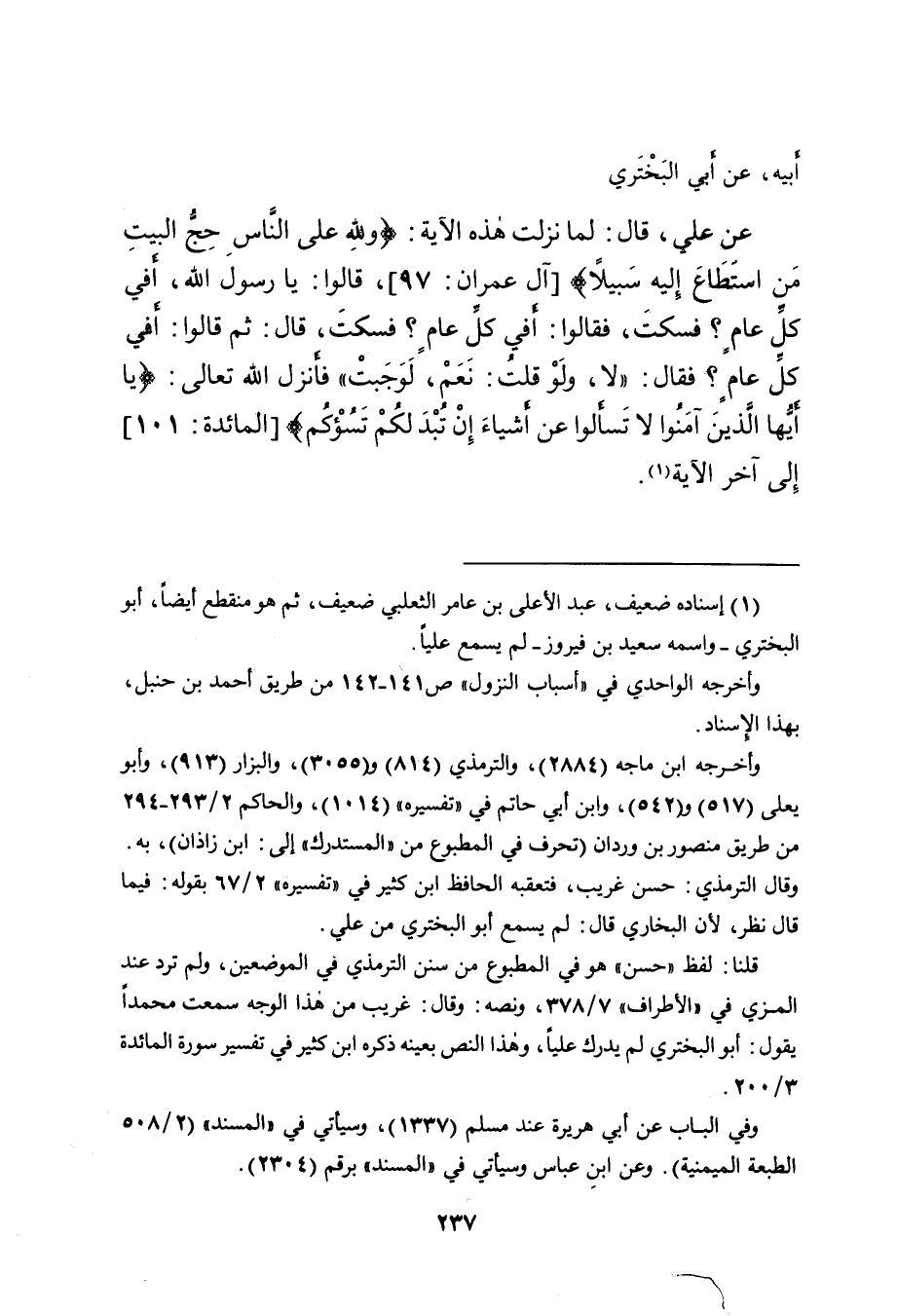 أَبِيهِ، عَنْ أَبِي الْبَخْتَرِيِّ، عَنْ عَلِيٍّ، قَالَ: لَمَّا نَزَلَتْ هَذِهِ الْآيَةُ: {وَلِلَّهِ عَلَى النَّاسِ حِجُّ الْبَيْتِ مَنِ اسْتَطَاعَ إِلَيْهِ سَبِيلًا} [آل عمران: ٩٧] ، قَالُوا: يَا رَسُولَ اللهِ، أَفِي كُلِّ عَامٍ؟ فَسَكَتَ، فَقَالُوا: أَفِي كُلِّ عَامٍ؟ فَسَكَتَ، قَالَ: ثُمَّ قَالُوا: أَفِي كُلِّ عَامٍ؟ فَقَالَ: " لَا، وَلَوْ قُلْتُ: نَعَمْ، لَوَجَبَتْ " فَأَنْزَلَ اللهُ تَعَالَى: {يَا أَيُّهَا الَّذِينَ آمَنُوا لَا تَسْأَلُوا عَنْ أَشْيَاءَ إِنْ تُبْدَ لَكُمْ تَسُؤْكُمْ} [المائدة: ١٠١] إِلَى آخِرِ الْآيَةِ (١)