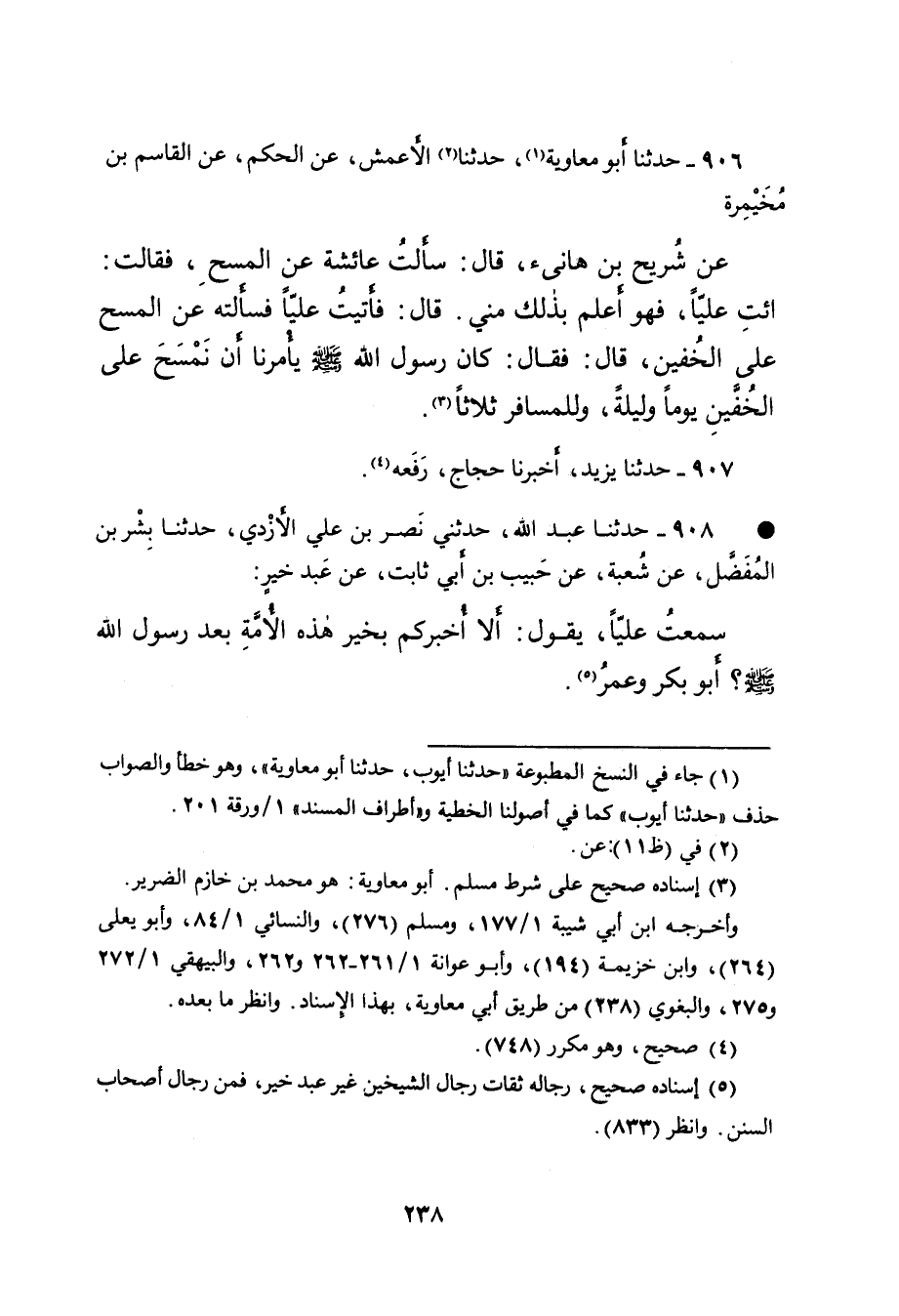 ٩٠٦ - حَدَّثَنَا أَبُو مُعَاوِيَةَ (١) ، حَدَّثَنَا (٢) الْأَعْمَشُ، عَنِ الْحَكَمِ، عَنِ الْقَاسِمِ بْنِ مُخَيْمِرَةَ، عَنْ شُرَيْحِ بْنِ هَانِئٍ، قَالَ: سَأَلْتُ عَائِشَةَ عَنِ الْمَسْحِ، فَقَالَتْ: ائْتِ عَلِيًّا، فَهُوَ أَعْلَمُ بِذَلِكَ مِنِّي. قَالَ: فَأَتَيْتُ عَلِيًّا فَسَأَلْتُهُ عَنِ الْمَسْحِ عَلَى الْخُفَّيْنِ قَالَ: فَقَالَ: " كَانَ رَسُولُ اللهِ صَلَّى اللهُ عَلَيْهِ وَسَلَّمَ يَأْمُرُنَا أَنْ نَمْسَحَ عَلَى الْخُفَّيْنِ يَوْمًا وَلَيْلَةً، وَلِلْمُسَافِرِ ثَلاثًا " (٣)