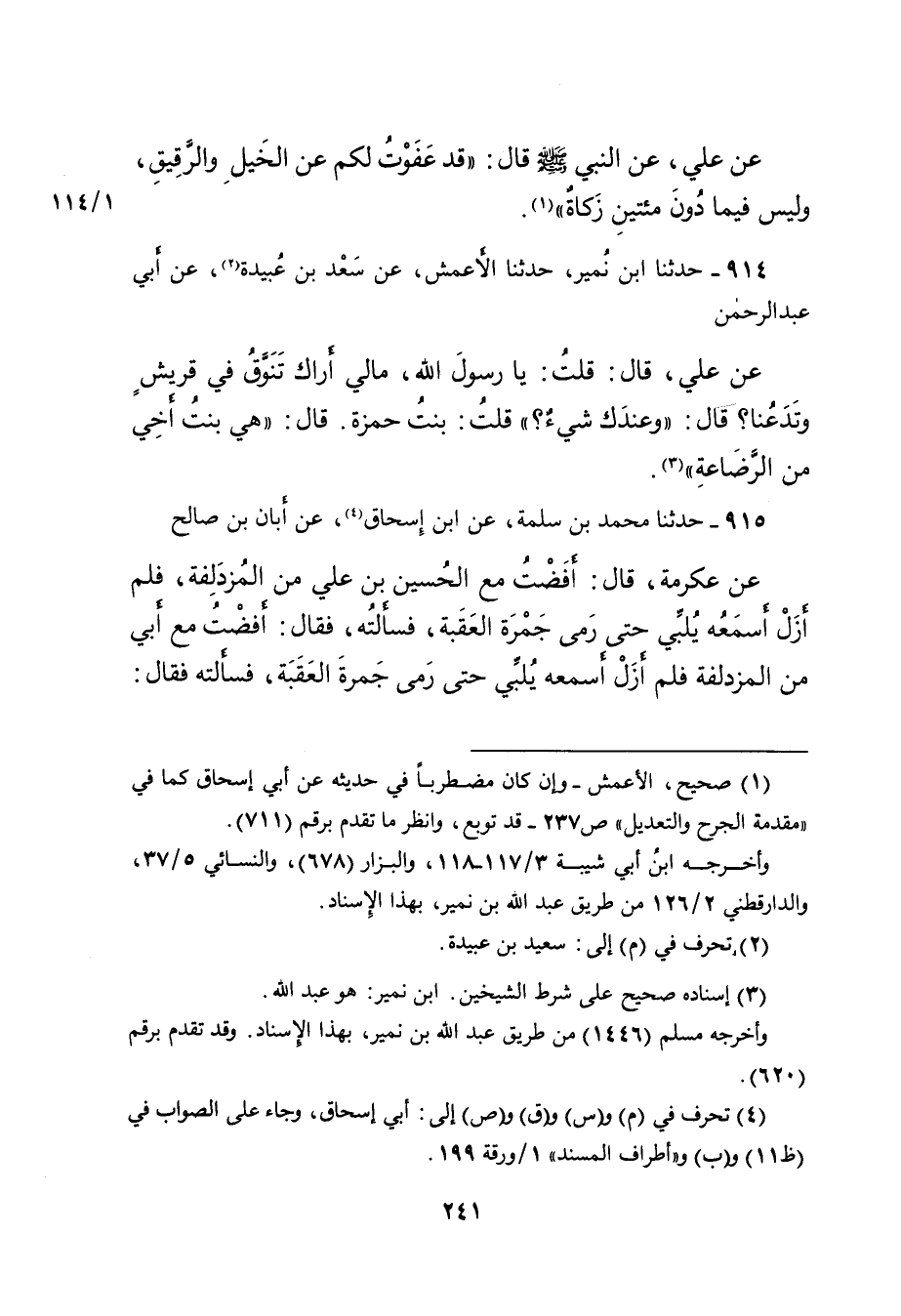 ٩١٤ - حَدَّثَنَا ابْنُ نُمَيْرٍ، حَدَّثَنَا الْأَعْمَشُ، عَنْ سَعْدِ بْنِ عُبَيْدَةَ (٢) ، عَنْ أَبِي عَبْدِ الرَّحْمَنِ، عَنْ عَلِيٍّ، قَالَ: قُلْتُ: يَا رَسُولَ اللهِ، مَا لِي أَرَاكَ تَنَوَّقُ فِي قُرَيْشٍ وَتَدَعُنَا؟ قَالَ: " وَعِنْدَكَ شَيْءٌ؟ " قُلْتُ: بِنْتُ حَمْزَةَ. قَالَ: " هِيَ بِنْتُ أَخِي مِنَ الرَّضَاعَةِ " (٣)
