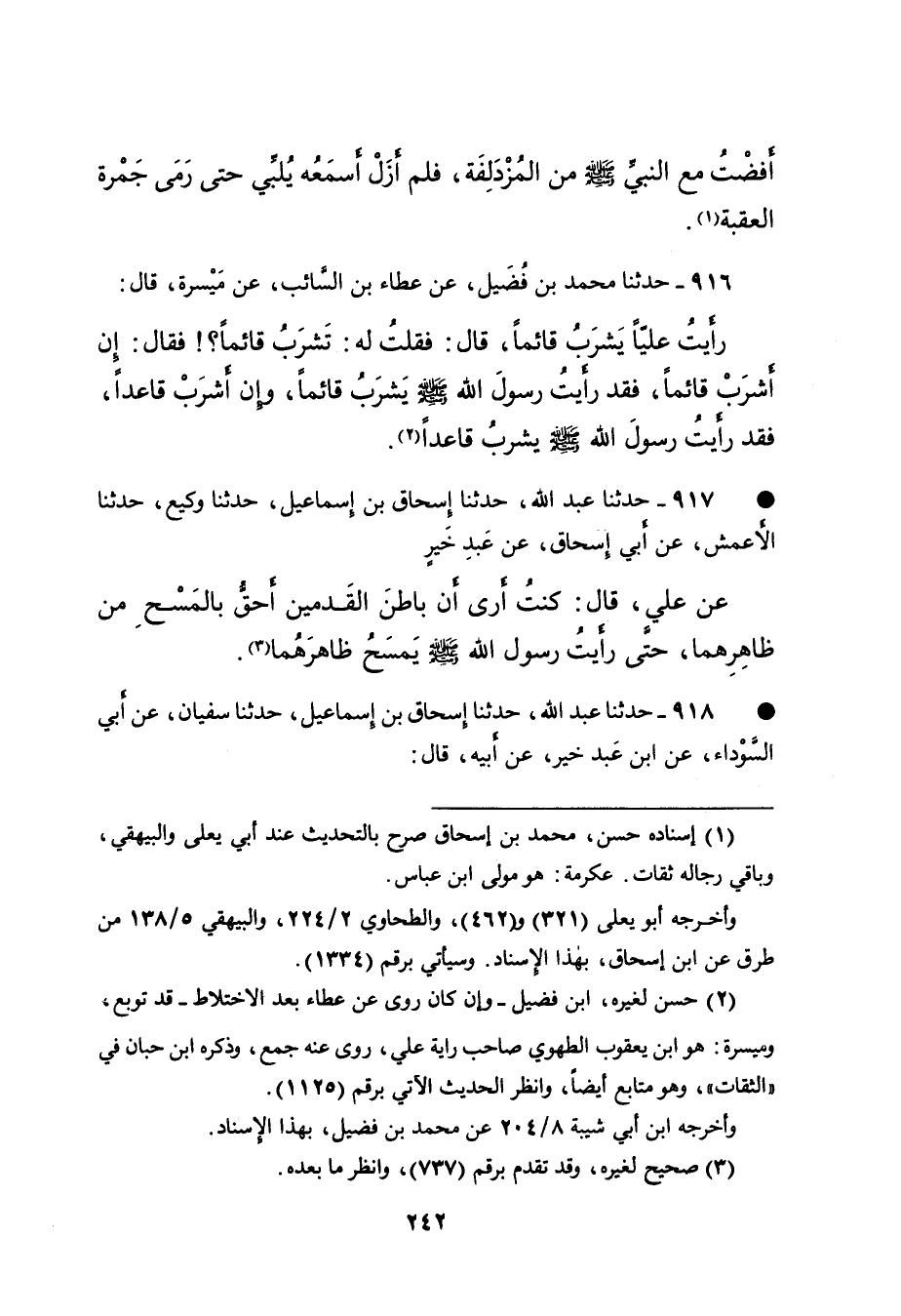 • ٩١٧ - حَدَّثَنَا عَبْدُ اللهِ، حَدَّثَنَا إِسْحَاقُ بْنُ إِسْمَاعِيلَ، حَدَّثَنَا وَكِيعٌ، حَدَّثَنَا الْأَعْمَشُ، عَنْ أَبِي إِسْحَاقَ، عَنْ عَبْدِ خَيْرٍ، عَنْ عَلِيٍّ، قَالَ: كُنْتُ أَرَى أَنَّ بَاطِنَ الْقَدَمَيْنِ أَحَقُّ بِالْمَسْحِ مِنْ ظَاهِرِهِمَا، حَتَّى " رَأَيْتُ رَسُولَ اللهِ صَلَّى اللهُ عَلَيْهِ وَسَلَّمَ يَمْسَحُ ظَاهِرَهُمَا " (٣)
