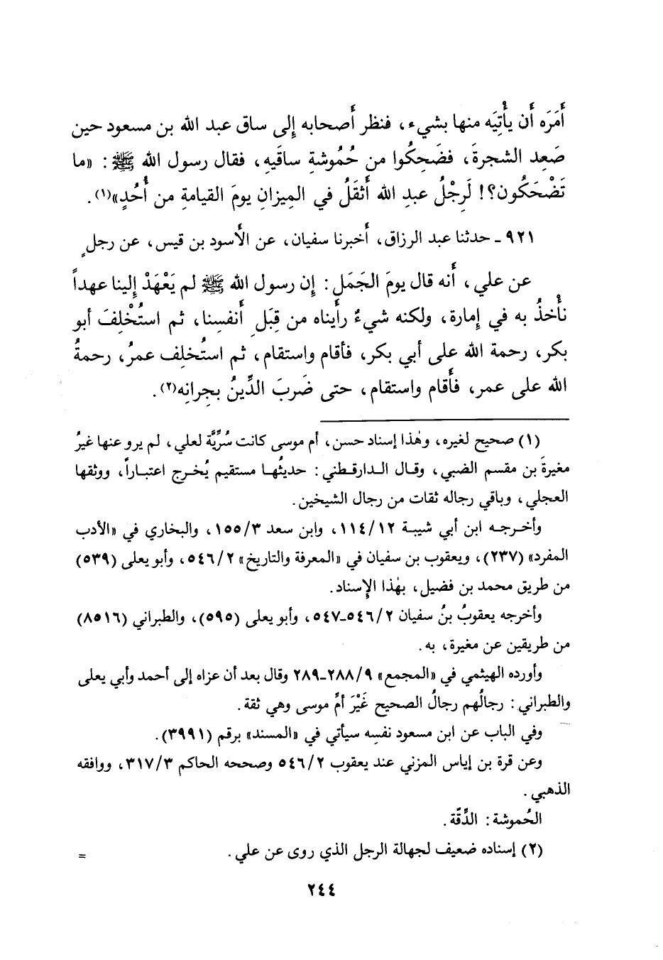 ٩٢١ - حَدَّثَنَا عَبْدُ الرَّزَّاقِ، أَخْبَرَنَا سُفْيَانُ، عَنِ الْأَسْوَدِ بْنِ قَيْسٍ، عَنْ رَجُلٍ، عَنْ عَلِيٍّ، أَنَّهُ قَالَ يَوْمَ الْجَمَلِ: " إِنَّ رَسُولَ اللهِ صَلَّى اللهُ عَلَيْهِ وَسَلَّمَ لَمْ يَعْهَدْ إِلَيْنَا عَهْدًا نَأْخُذُ بِهِ فِي إِمَارَةٍ، وَلَكِنَّهُ شَيْءٌ رَأَيْنَاهُ مِنْ قِبَلِ أَنْفُسِنَا، ثُمَّ اسْتُخْلِفَ أَبُو بَكْرٍ رَحْمَةُ اللهِ، عَلَى أَبِي بَكْرٍ، فَأَقَامَ وَاسْتَقَامَ، ثُمَّ اسْتُخْلِفَ عُمَرُ رَحْمَةُ اللهِ، عَلَى عُمَرَ، فَأَقَامَ وَاسْتَقَامَ، حَتَّى ضَرَبَ الدِّينُ بِجِرَانِهِ " (٢)