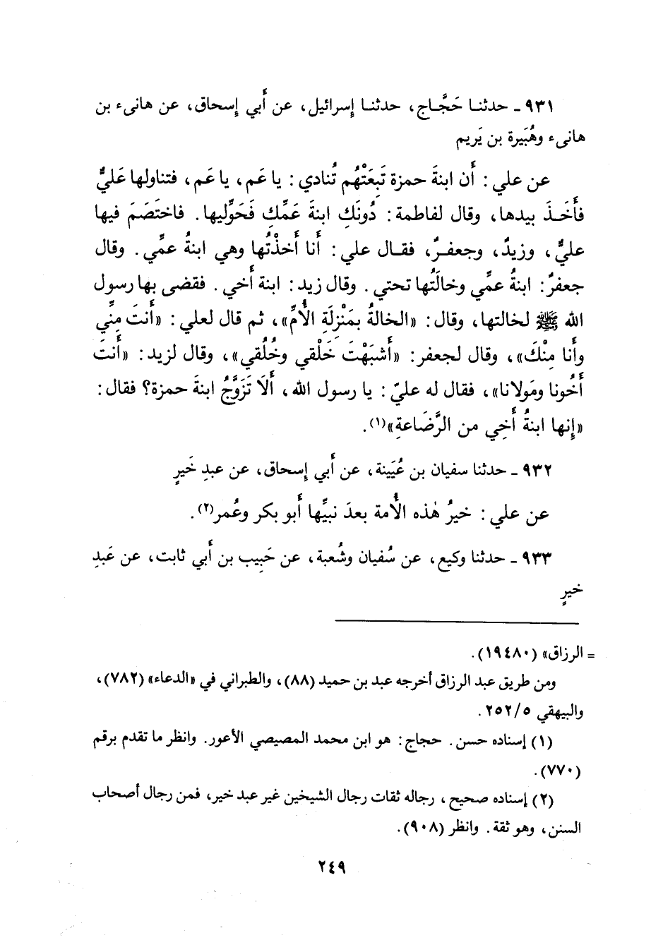 ٩٣١ - حَدَّثَنَا حَجَّاجٌ، حَدَّثَنَا إِسْرَائِيلُ، عَنْ أَبِي إِسْحَاقَ، عَنْ هَانِئِ بْنِ هَانِئٍ، وَهُبَيْرَةَ بْنِ يَرِيمَ، عَنْ عَلِيٍّ، أَنَّ ابْنَةَ حَمْزَةَ تَبِعَتْهُمْ تُنَادِي: يَا عَمُّ، يَا عَمُّ، فَتَنَاوَلَهَا عَلِيٌّ فَأَخَذَ بِيَدِهَا، وَقَالَ لِفَاطِمَةَ: دُونَكِ ابْنَةَ عَمِّكِ فَحَوِّلِيهَا، فَاخْتَصَمَ فِيهَا عَلِيٌّ، وَزَيْدٌ، وَجَعْفَرٌ، فَقَالَ عَلِيٌّ: أَنَا أَخَذْتُهَا وَهِيَ ابْنَةُ عَمِّي، وَقَالَ جَعْفَرٌ: ابْنَةُ عَمِّي وَخَالَتُهَا تَحْتِي. وَقَالَ زَيْدٌ: ابْنَةُ أَخِي. فَقَضَى بِهَا رَسُولُ اللهِ صَلَّى اللهُ عَلَيْهِ وَسَلَّمَ لِخَالَتِهَا، وَقَالَ: " الْخَالَةُ بِمَنْزِلَةِ الْأُمِّ " ثُمَّ قَالَ لِعَلِيٍّ: " أَنْتَ مِنِّي، وَأَنَا مِنْكَ " وَقَالَ لِجَعْفَرٍ: " أَشْبَهْتَ خَلْقِي وَخُلُقِي " وَقَالَ لِزَيْدٍ: " أَنْتَ أَخُونَا وَمَوْلانَا " فَقَالَ لَهُ عَلِيٌّ: يَا رَسُولَ اللهِ، أَلا تَزَوَّجُ ابْنَةَ حَمْزَةَ؟ فَقَالَ: " إِنَّهَا ابْنَةُ أَخِي مِنَ الرَّضَاعَةِ " (١)
