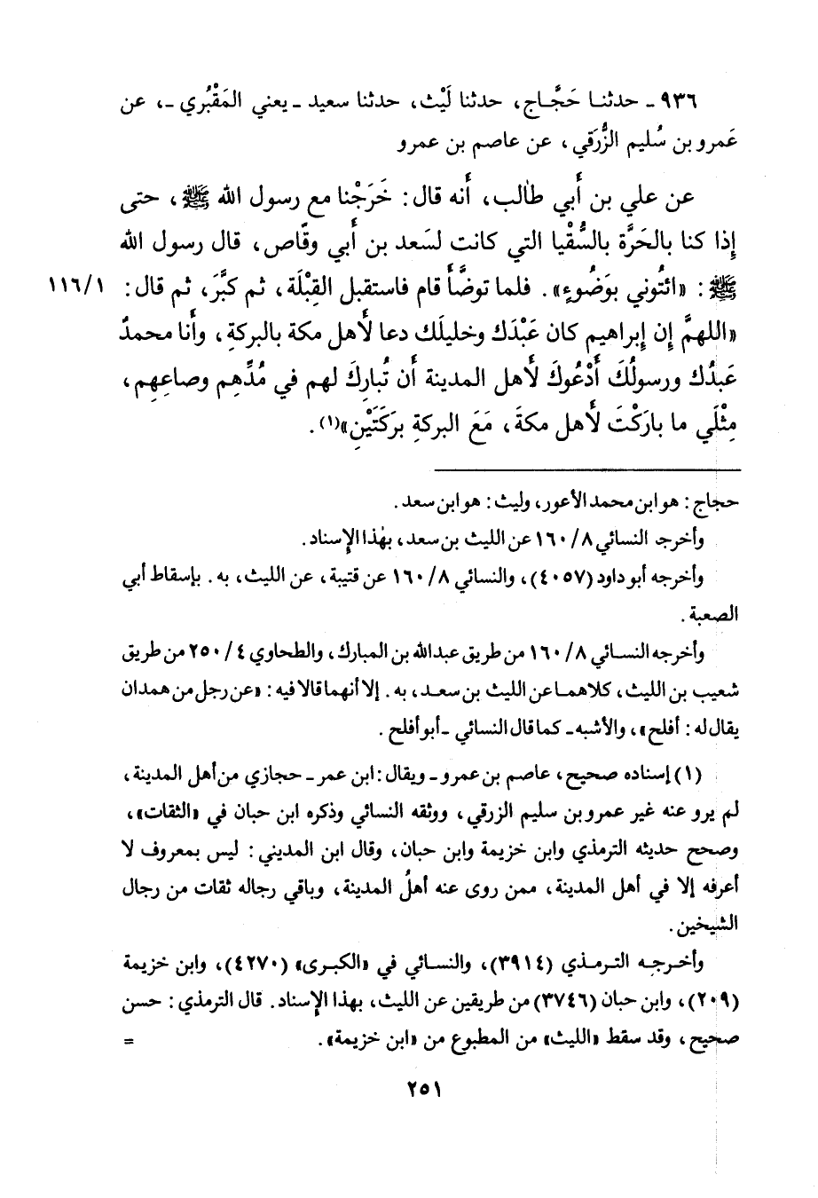٩٣٦ - حَدَّثَنَا حَجَّاجٌ، حَدَّثَنَا لَيْثٌ، حَدَّثَنَا سَعِيدٌ يَعْنِي الْمَقْبُرِيَّ، عَنْ عَمْرِو بْنِ سُلَيْمٍ الزُّرَقِيِّ، عَنْ عَاصِمِ بْنِ عَمْرٍو، عَنْ عَلِيِّ بْنِ أَبِي طَالِبٍ، أَنَّهُ قَالَ: خَرَجْنَا مَعَ رَسُولِ اللهِ صَلَّى اللهُ عَلَيْهِ وَسَلَّمَ، حَتَّى إِذَا كُنَّا بِالْحَرَّةِ بِالسُّقْيَا الَّتِي كَانَتْ لِسَعْدِ بْنِ أَبِي وَقَّاصٍ، قَالَ رَسُولُ اللهِ صَلَّى اللهُ عَلَيْهِ وَسَلَّمَ: " ائْتُونِي بِوَضُوءٍ " فَلَمَّا تَوَضَّأَ قَامَ فَاسْتَقْبَلَ الْقِبْلَةَ، ثُمَّ كَبَّرَ، ثُمَّ قَالَ: " اللهُمَّ إِنَّ إِبْرَاهِيمَ كَانَ عَبْدَكَ، وَخَلِيلَكَ، دَعَا لِأَهْلِ مَكَّةَ بِالْبَرَكَةِ، وَأَنَا مُحَمَّدٌ عَبْدُكَ وَرَسُولُكَ، أَدْعُوكَ لِأَهْلِ الْمَدِينَةِ أَنْ تُبَارِكَ لَهُمْ فِي مُدِّهِمْ وَصَاعِهِمْ، مِثْلَيْ مَا بَارَكْتَ لِأَهْلِ مَكَّةَ، مَعَ الْبَرَكَةِ بَرَكَتَيْنِ " (١)