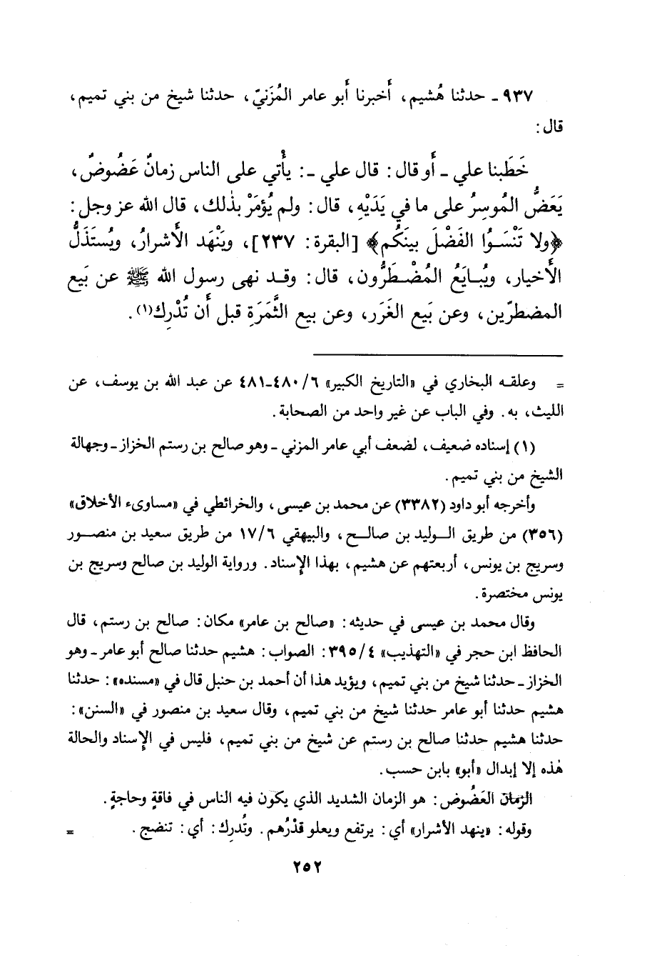 ٩٣٧ - حَدَّثَنَا هُشَيْمٌ، أَخْبَرَنَا أَبُو عَامِرٍ الْمُزَنِيُّ، حَدَّثَنَا شَيْخٌ، مِنْ بَنِي تَمِيمٍ، قَالَ: خَطَبَنَا عَلِيٌّ - أَوْ قَالَ: قَالَ عَلِيٌّ -: يَأْتِي عَلَى النَّاسِ زَمَانٌ عَضُوضٌ، يَعَضُّ الْمُوسِرُ عَلَى مَا فِي يَدَيْهِ، قَالَ: وَلَمْ يُؤْمَرْ بِذَلِكَ، قَالَ اللهُ عَزَّ وَجَلَّ: {وَلا تَنْسَوْا الْفَضْلَ بَيْنَكُمْ} [البقرة: ٢٣٧] وَيَنْهَدُ الْأَشْرَارُ، وَيُسْتَذَلُّ الْأَخْيَارُ، وَيُبَايِعُ الْمُضْطَرُّونَ، قَالَ: وَقَدْ: " نَهَى رَسُولُ اللهِ صَلَّى اللهُ عَلَيْهِ وَسَلَّمَ عَنْ بَيْعِ الْمُضْطَرِّينَ، وَعَنْ بَيْعِ الْغَرَرِ، وَعَنْ بَيْعِ الثَّمَرَةِ قَبْلَ أَنْ تُدْرِكَ " (١)