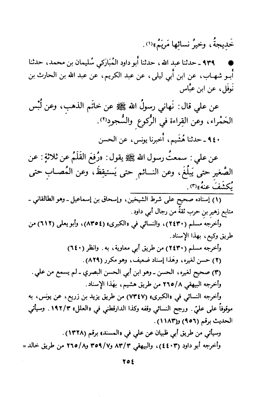 ٩٤٠ - حَدَّثَنَا هُشَيْمٌ، أَخْبَرَنَا يُونُسُ، عَنِ الْحَسَنِ، عَنْ عَلِيٍّ، سَمِعْتُ رَسُولَ اللهِ صَلَّى اللهُ عَلَيْهِ وَسَلَّمَ يَقُولُ: " رُفِعَ الْقَلَمُ عَنْ ثَلاثَةٍ: عَنِ الصَّغِيرِ حَتَّى يَبْلُغَ، وَعَنِ النَّائِمِ حَتَّى يَسْتَيْقِظَ، وَعَنِ الْمُصَابِ حَتَّى يُكْشَفَ عَنْهُ " (٣)