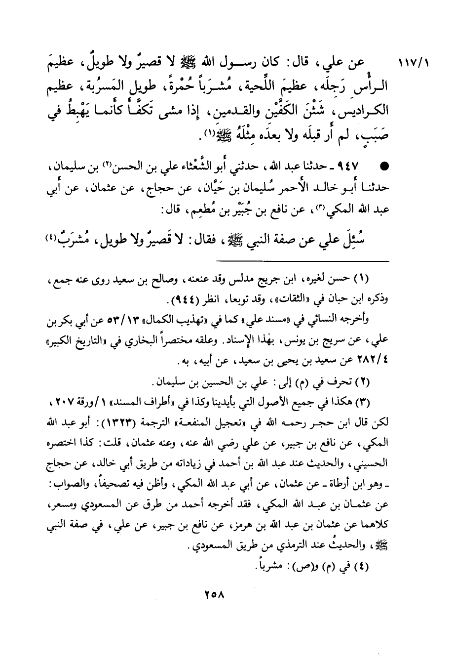 • ٩٤٧ - حَدَّثَنَا عَبْدُ اللهِ، حَدَّثَنِي أَبُو الشَّعْثَاءِ عَلِيُّ بْنُ الْحَسَنِ (٢) بْنِ سُلَيْمَانَ، حَدَّثَنَا أَبُو خَالِدٍ الْأَحْمَرُ سُلَيْمَانُ بْنُ حَيَّانَ، عَنْ حَجَّاجٍ، عَنْ عُثْمَانَ، عَنْ أَبِي عَبْدِ اللهِ الْمَكِّيِّ (٣) ، عَنْ نَافِعِ بْنِ جُبَيْرِ بْنِ مُطْعِمٍ، قَالَ: سُئِلَ عَلِيٌّ، عَنْ صِفَةِ النَّبِيِّ صَلَّى اللهُ عَلَيْهِ وَسَلَّمَ، فَقَالَ: " لَا قَصِيرٌ وَلَا طَوِيلٌ، مُشْرَبٌ (٤)