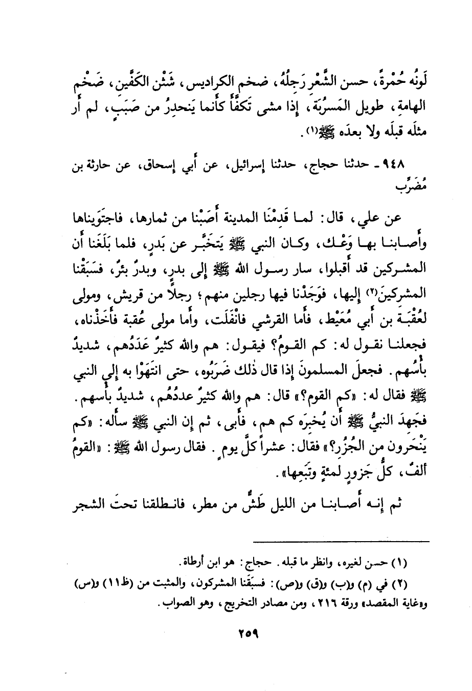 ٩٤٨ - حَدَّثَنَا حَجَّاجٌ، حَدَّثَنَا إِسْرَائِيلُ، عَنْ أَبِي إِسْحَاقَ، عَنْ حَارِثَةَ بْنِ مُضَرِّبٍ، عَنْ عَلِيٍّ، قَالَ: لَمَّا قَدِمْنَا الْمَدِينَةَ أَصَبْنَا مِنْ ثِمَارِهَا، فَاجْتَوَيْنَاهَا وَأَصَابَنَا بِهَا وَعْكٌ، وَكَانَ النَّبِيُّ صَلَّى اللهُ عَلَيْهِ وَسَلَّمَ يَتَخَبَّرُ عَنْ بَدْرٍ، فَلَمَّا بَلَغَنَا أَنَّ الْمُشْرِكِينَ (٢) قَدْ أَقْبَلُوا، سَارَ رَسُولُ اللهِ صَلَّى اللهُ عَلَيْهِ وَسَلَّمَ إِلَى بَدْرٍ، وَبَدْرٌ بِئْرٌ، فَسَبَقْنَا الْمُشْرِكِينَ إِلَيْهَا، فَوَجَدْنَا فِيهَا رَجُلَيْنِ مِنْهُمْ، رَجُلًا مِنْ قُرَيْشٍ، وَمَوْلًى لِعُقْبَةَ بْنِ أَبِي مُعَيْطٍ، فَأَمَّا الْقُرَشِيُّ فَانْفَلَتَ، وَأَمَّا مَوْلَى عُقْبَةَ فَأَخَذْنَاهُ، فَجَعَلْنَا نَقُولُ لَهُ: كَمِ الْقَوْمُ؟ فَيَقُولُ: هُمْ وَاللهِ كَثِيرٌ عَدَدُهُمْ، شَدِيدٌ بَأْسُهُمْ. فَجَعَلَ الْمُسْلِمُونَ إِذْ قَالَ ذَلِكَ ضَرَبُوهُ، حَتَّى انْتَهَوْا بِهِ إِلَى النَّبِيِّ صَلَّى اللهُ عَلَيْهِ وَسَلَّمَ فَقَالَ لَهُ: " كَمِ الْقَوْمُ؟ " قَالَ: هُمْ وَاللهِ كَثِيرٌ عَدَدُهُمْ، شَدِيدٌ بَأْسُهُمْ فَجَهَدَ النَّبِيُّ صَلَّى اللهُ عَلَيْهِ وَسَلَّمَ أَنْ يُخْبِرَهُ كَمْ هُمْ، فَأَبَى ثُمَّ إِنَّ النَّبِيَّ صَلَّى اللهُ عَلَيْهِ وَسَلَّمَ سَأَلَهُ: " كَمْ يَنْحَرُونَ مِنَ الْجُزُرِ؟ " فَقَالَ: عَشْرًا كُلَّ يَوْمٍ، فَقَالَ رَسُولُ اللهِ صَلَّى اللهُ عَلَيْهِ وَسَلَّمَ: " الْقَوْمُ أَلْفٌ، كُلُّ جَزُورٍ لِمِائَةٍ وَتَبِعَهَا " ثُمَّ إِنَّهُ أَصَابَنَا مِنَ اللَّيْلِ طَشٌّ مِنْ مَطَرٍ، فَانْطَلَقْنَا تَحْتَ الشَّجَرِ