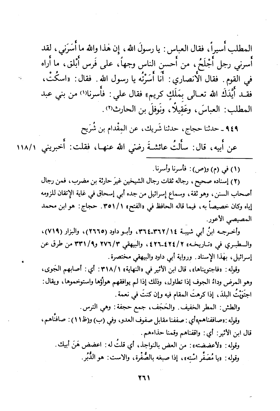 ٩٤٩ - حَدَّثَنَا حَجَّاجٌ، حَدَّثَنَا شَرِيكٌ، عَنِ الْمِقْدَامِ بْنِ شُرَيْحٍ، عَنْ أَبِيهِ، قَالَ: سَأَلْتُ عَائِشَةَ رَضِيَ اللهُ عَنْهَا، فَقُلْتُ: أَخْبِرِينِي